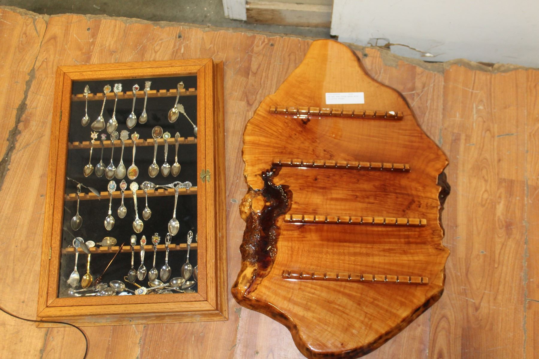 OAK AND BURL SPOON RACKS WITH COLLECTOR SPOONS