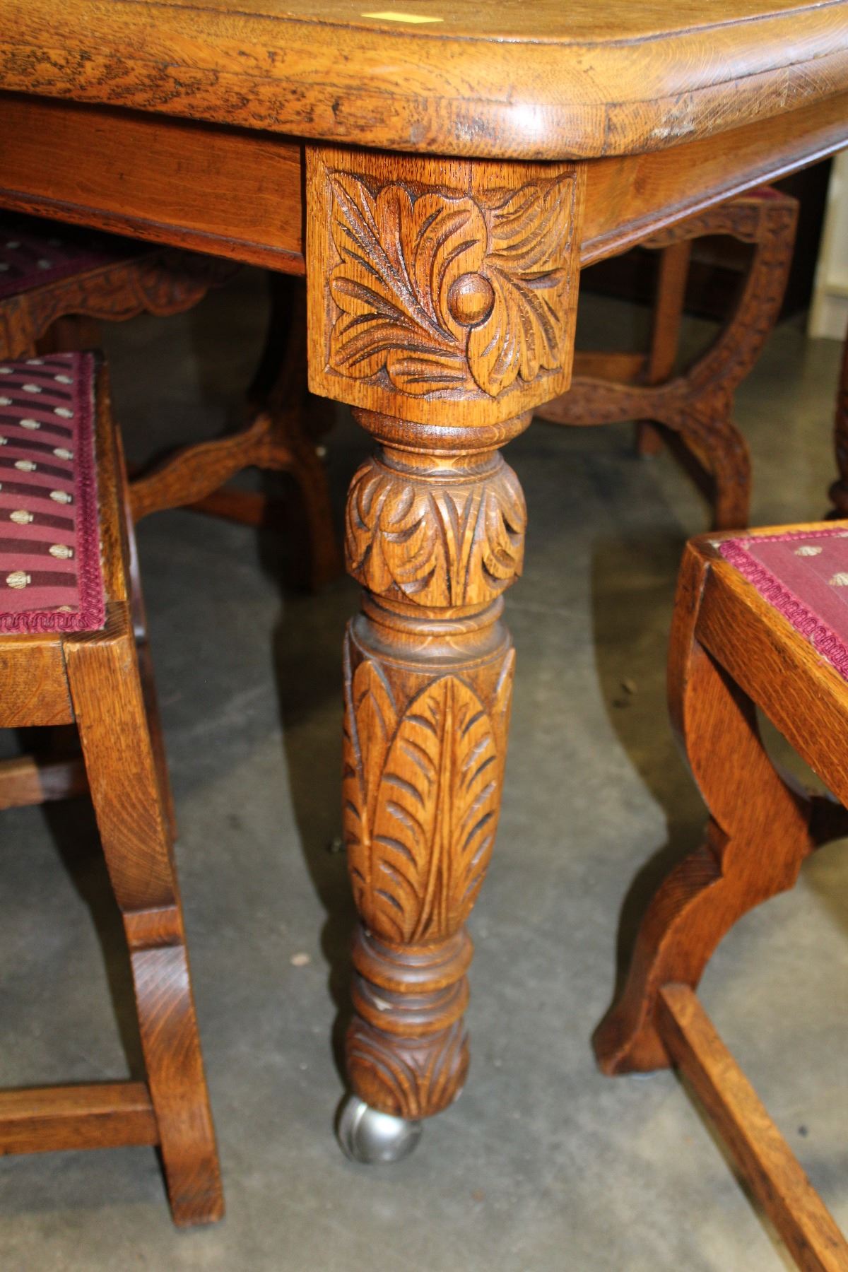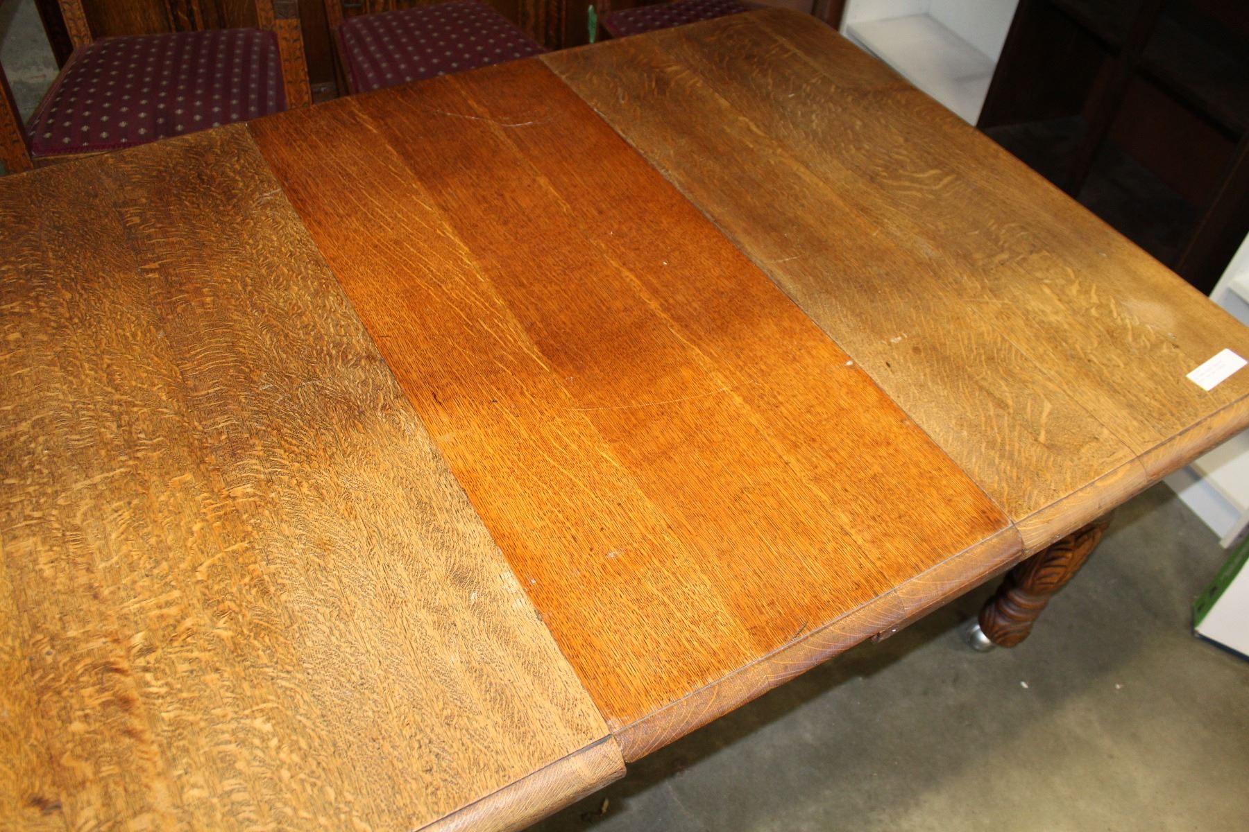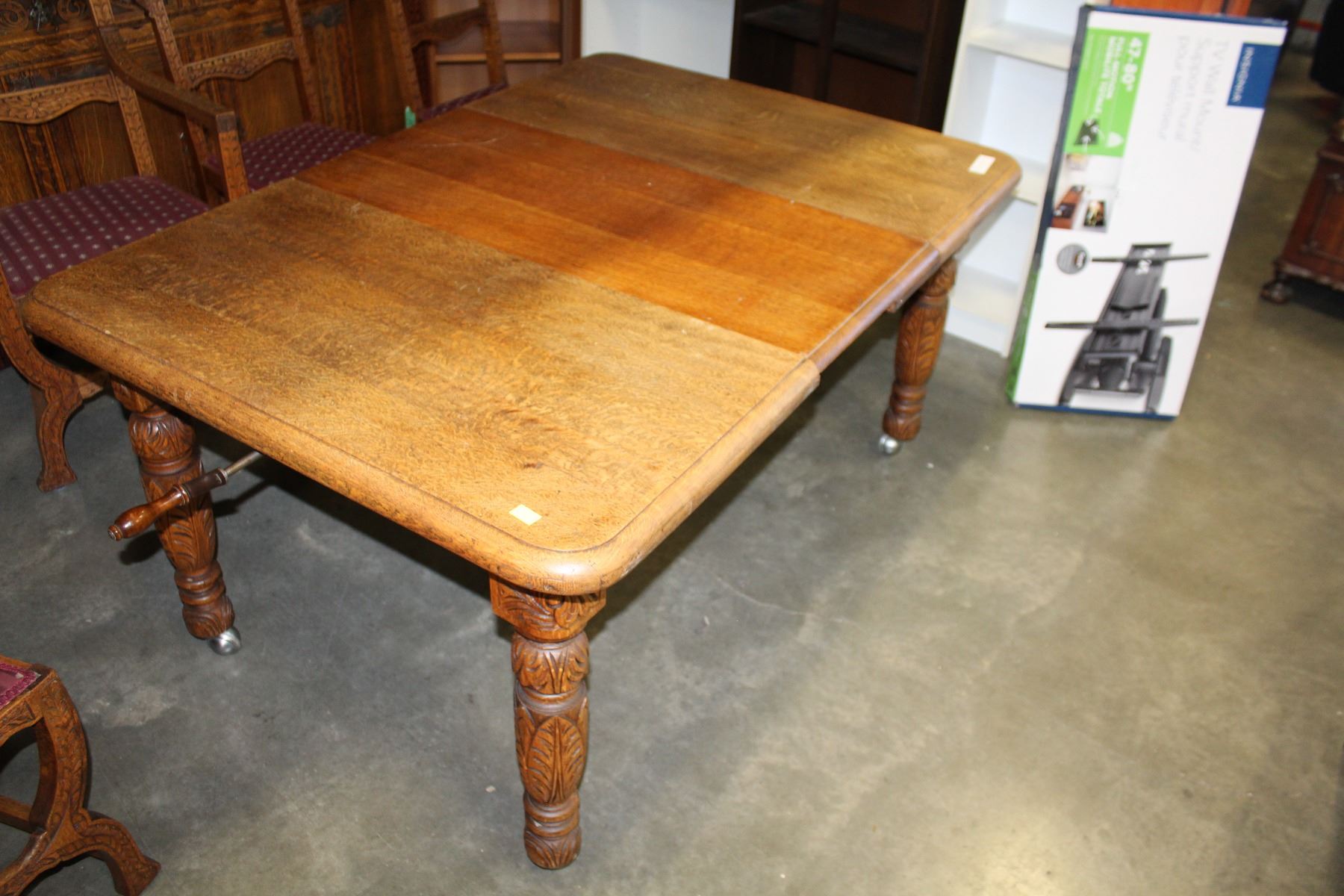 OAK CRANK DINING TABLE W/ CARVED LEGS AND 6 CHAIRS