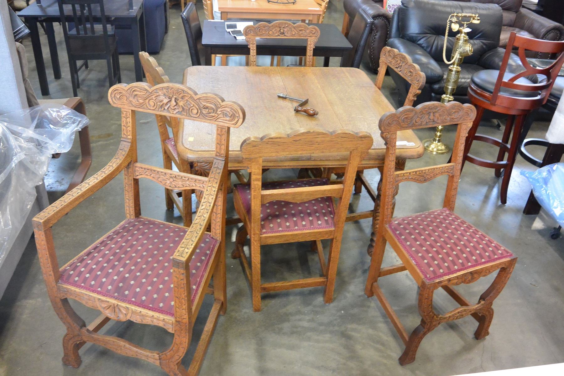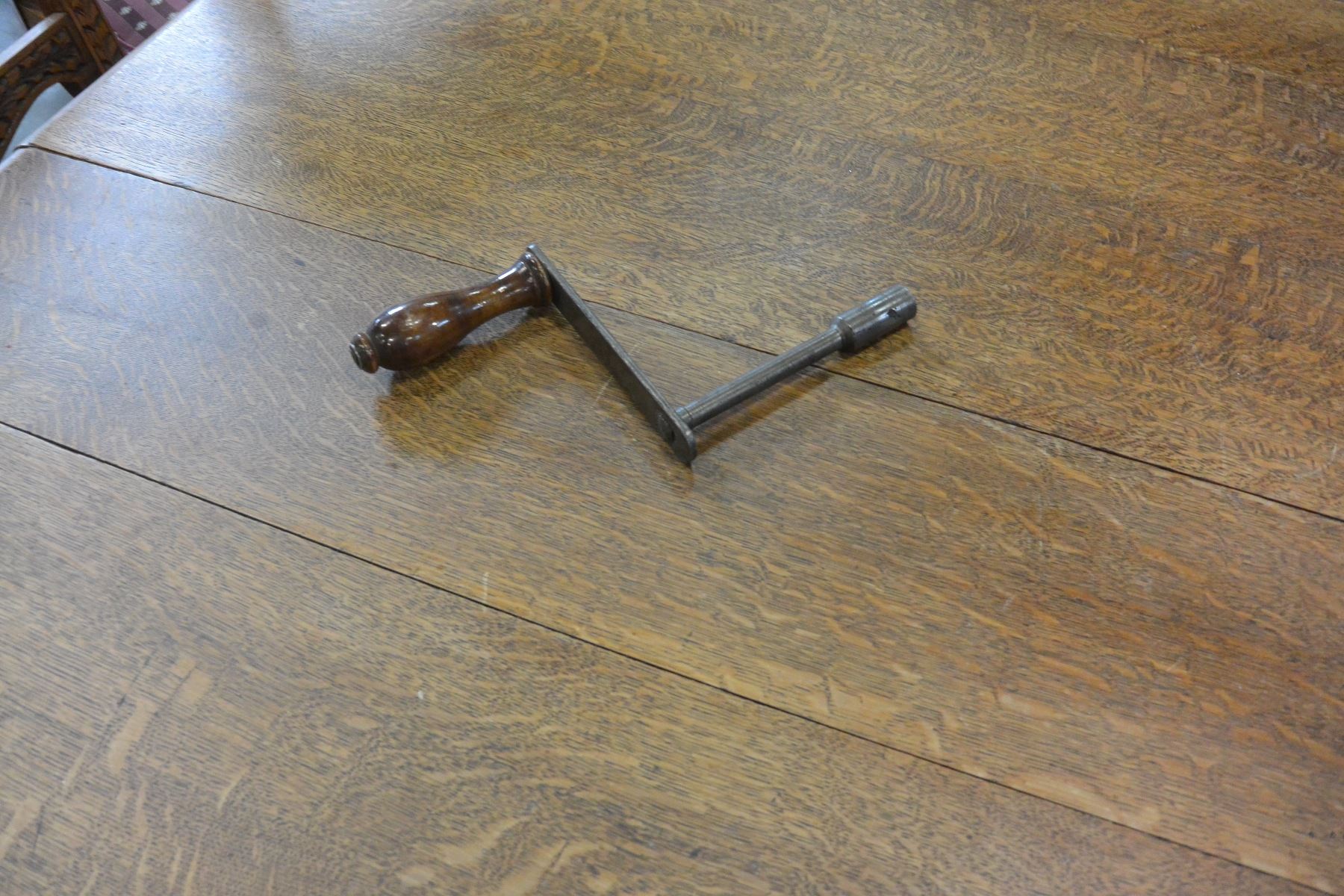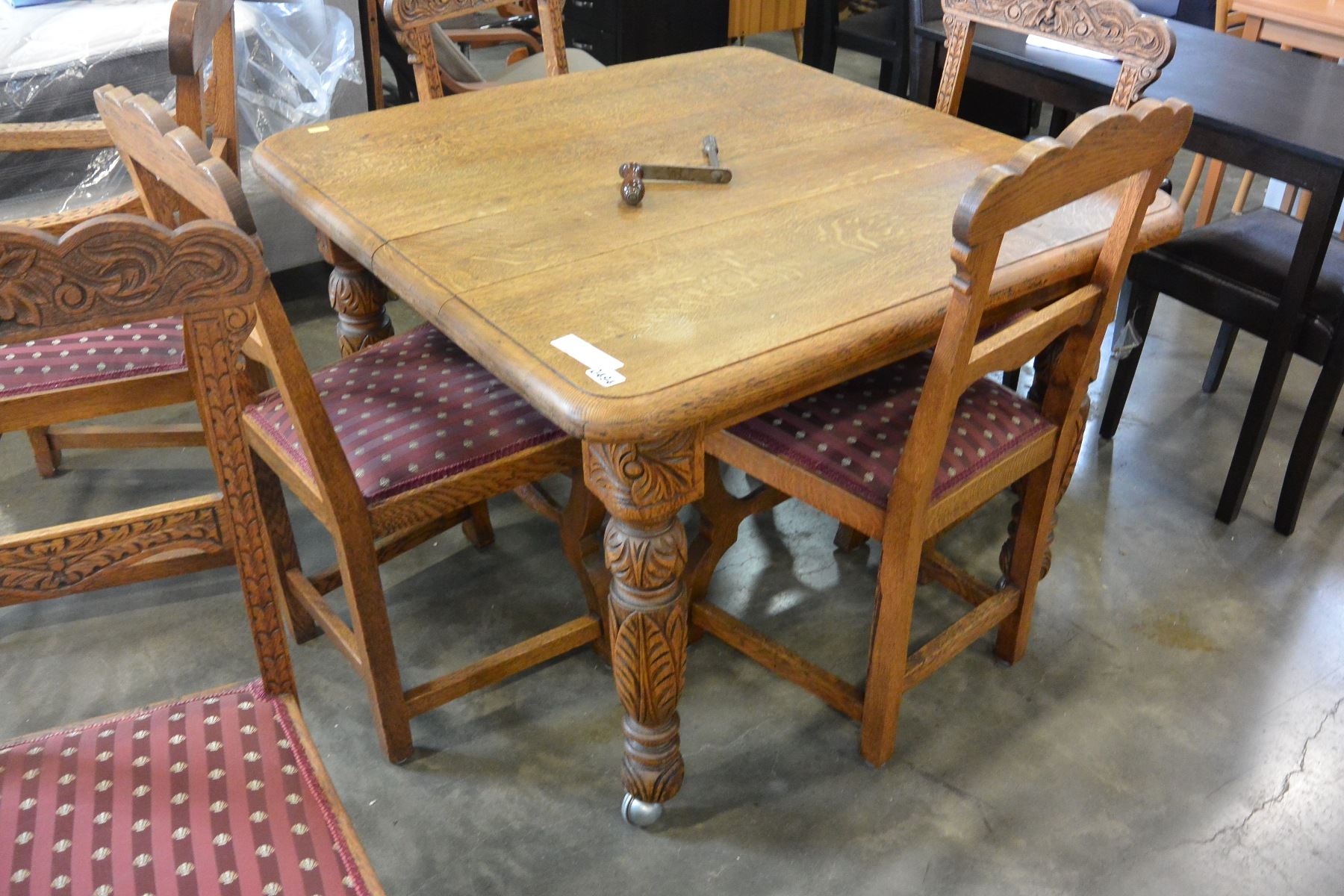 OAK CRANK DINING TABLE W/ CARVED LEGS AND 6 CHAIRS