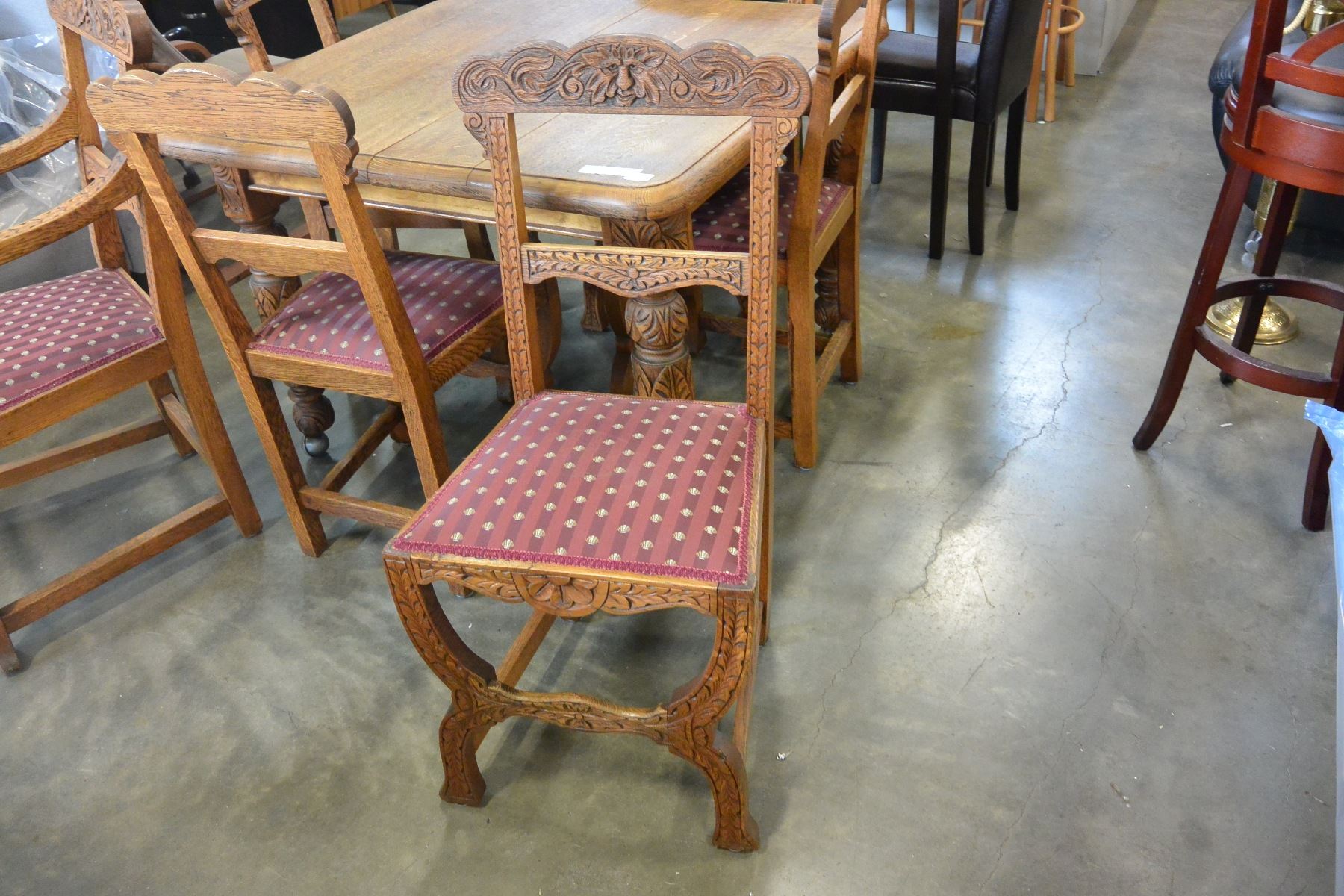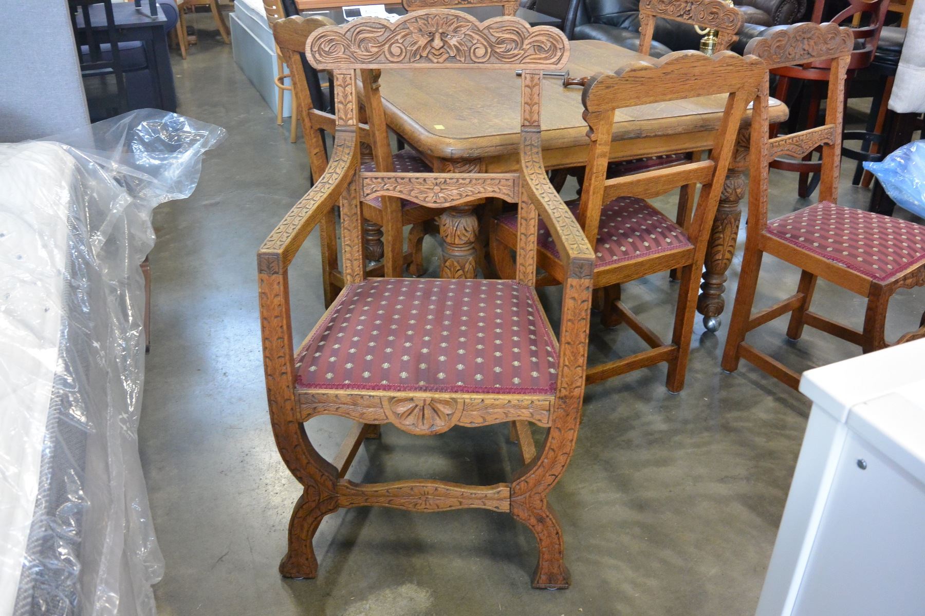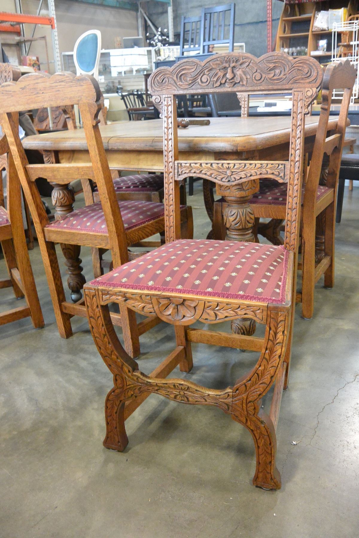 OAK CRANK DINING TABLE W/ CARVED LEGS AND 6 CHAIRS