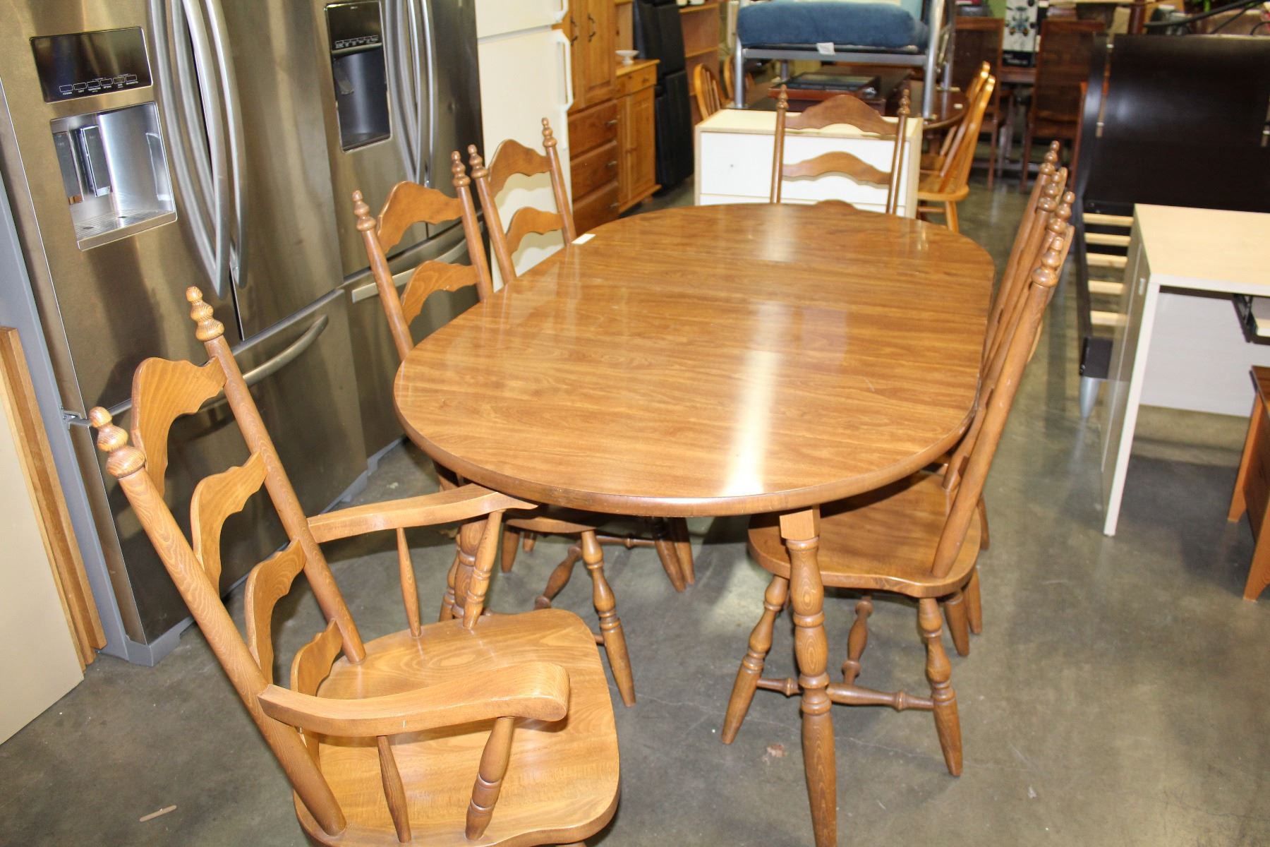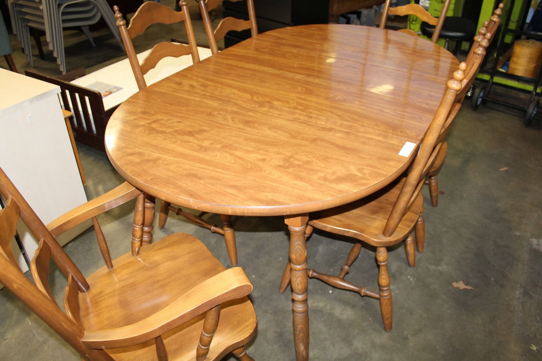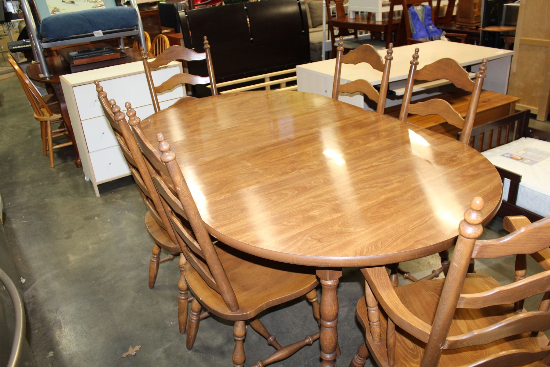 OAK FINISH TABLE WITH TWO LEAFS AND FIVE LADDER BACK CHAIRS