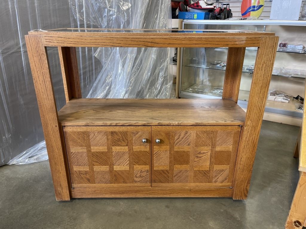 OAK GLASS TOP ROLLING 'PARQUAT' CABINET