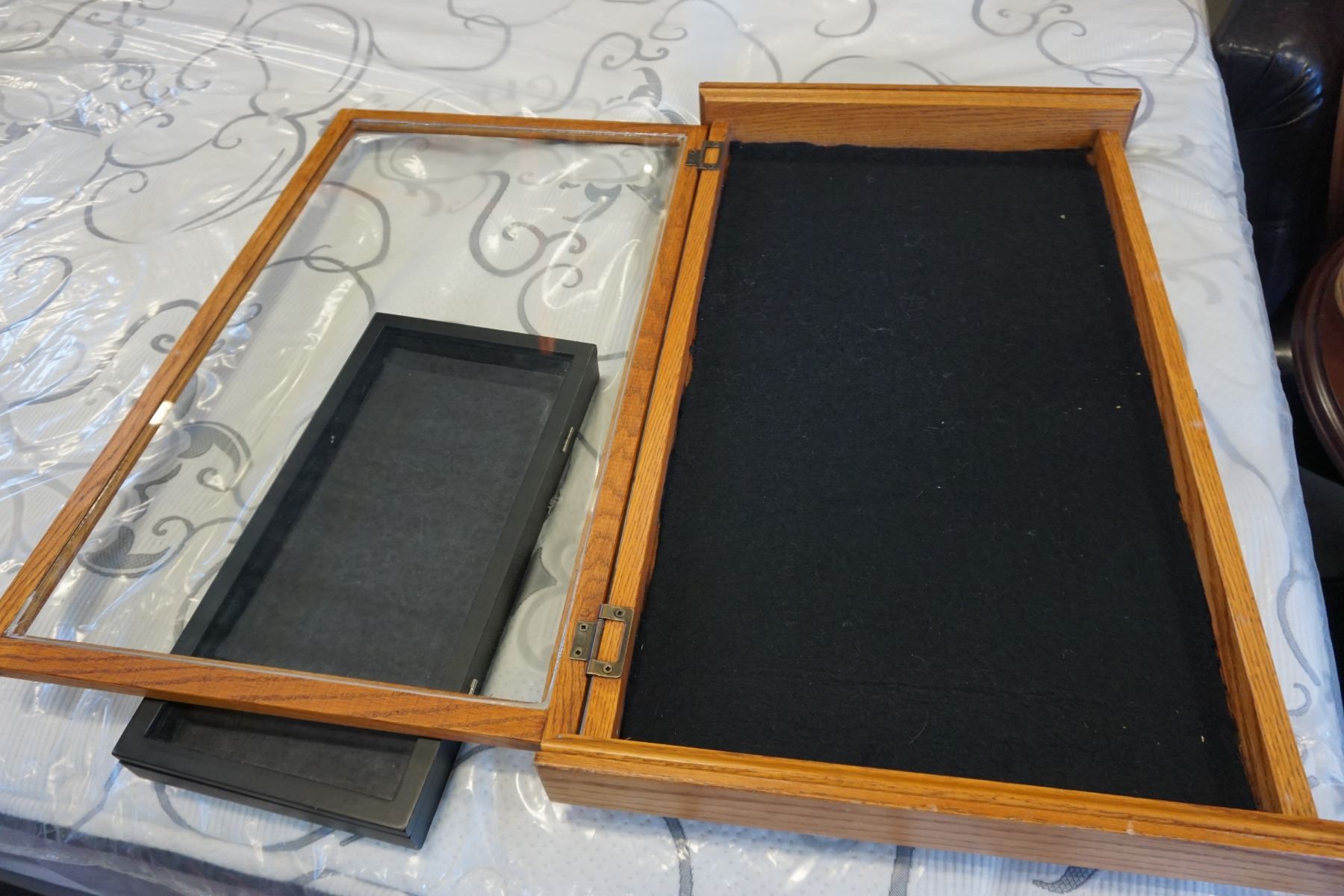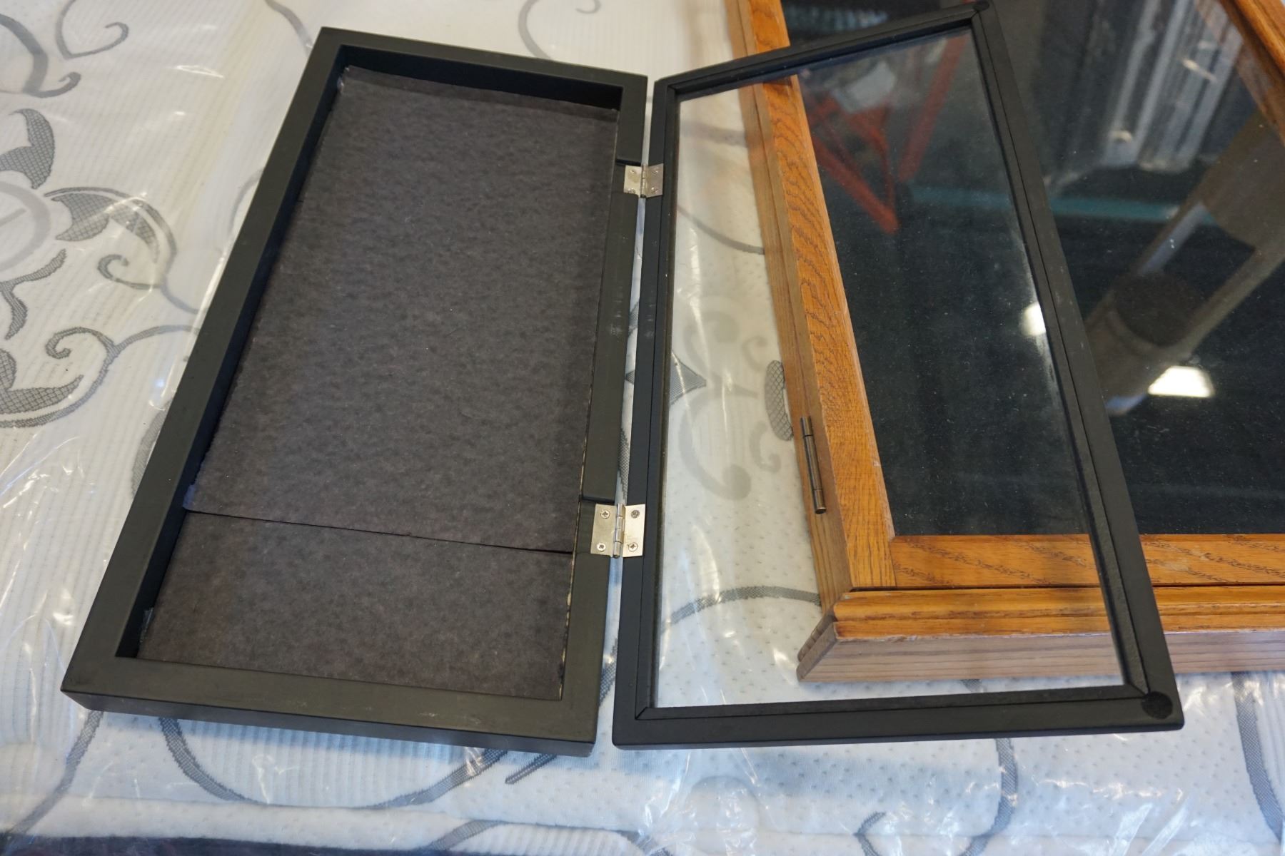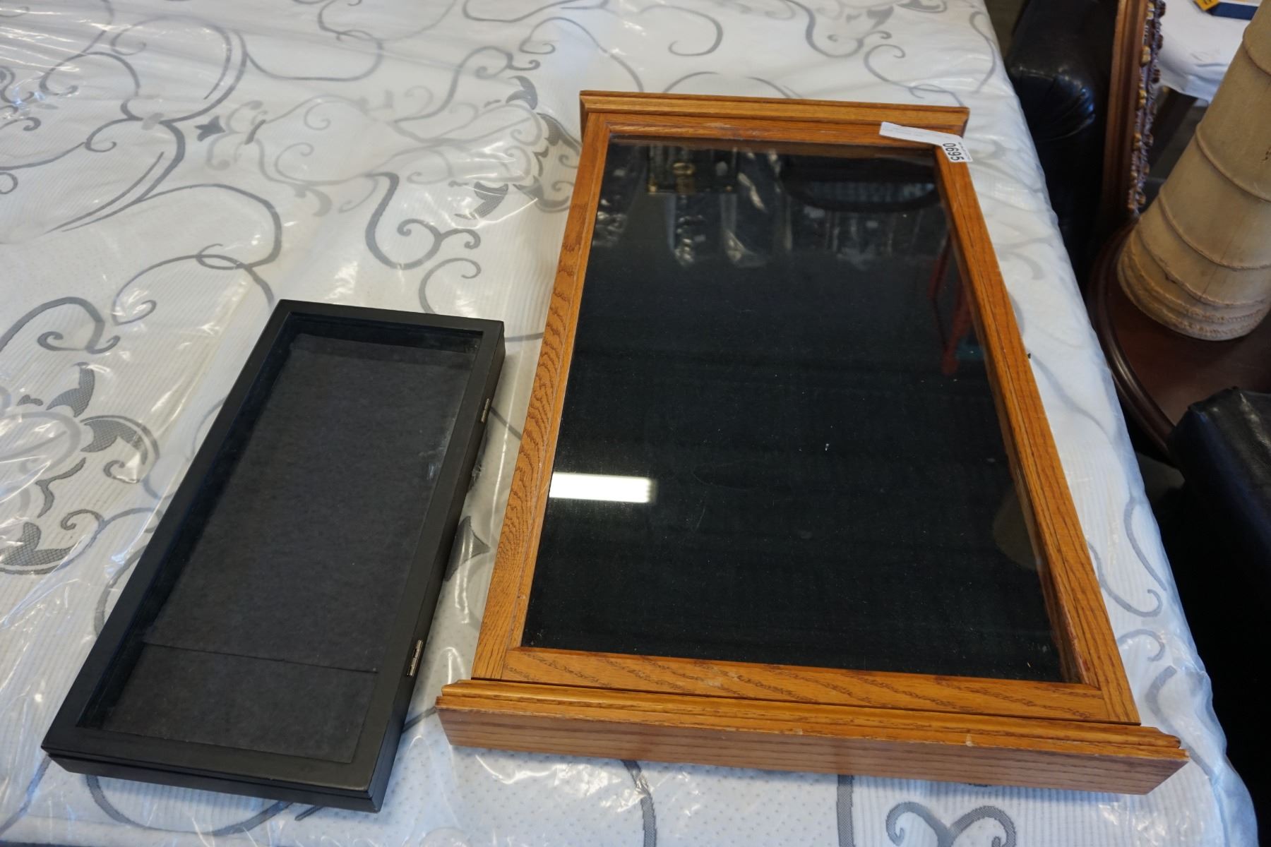 OAK JEWELLERY DISPLAY CASE AND BLACK DISPLAY CASE