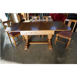 ANTIQUE ENGLISH OAK CARVED DINING TABLE DRAWLEAF WITH 4 CHAIRS