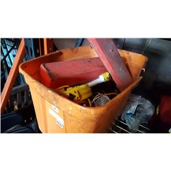 ORANGE TOTE OF TROUBLE LIGHTS, EXTENTION CORDS, AND ROAD FLARES