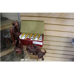 2 CARVED WOOD EASTERN FIGURES AND SAKI CUPS