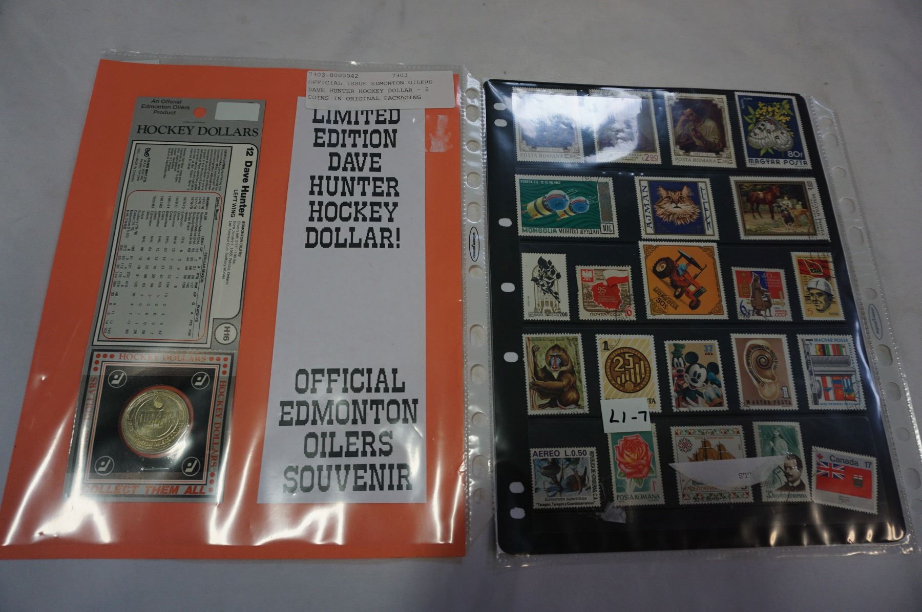 OFFICIAL ISSUE EDMONTON OILERS DAVE HUNTER HOCKEY DOLLAR - 2 COINS IN ORIGINAL PACKAGING AND PAGE OF STAMPS