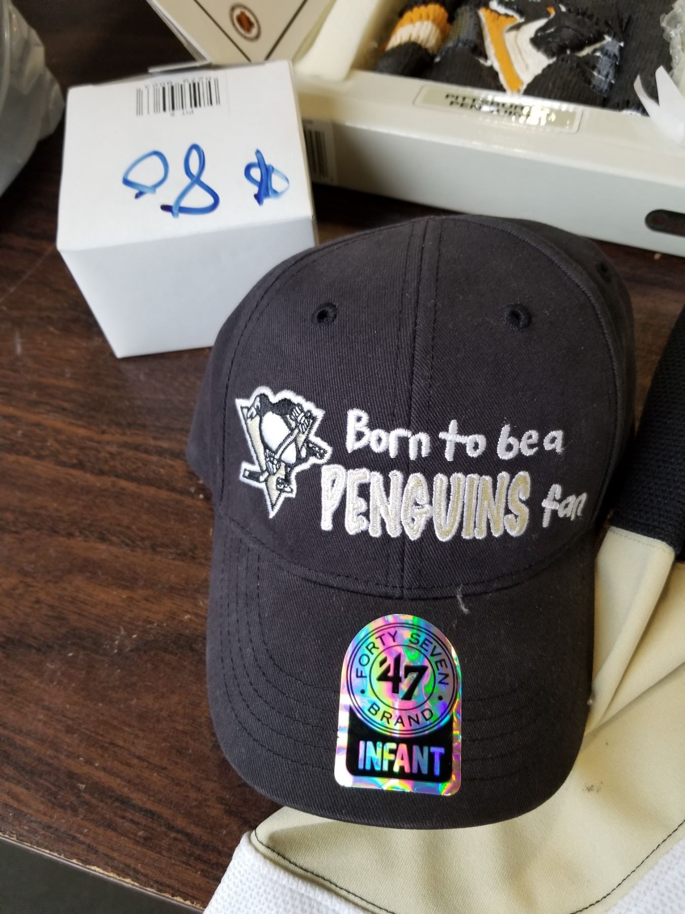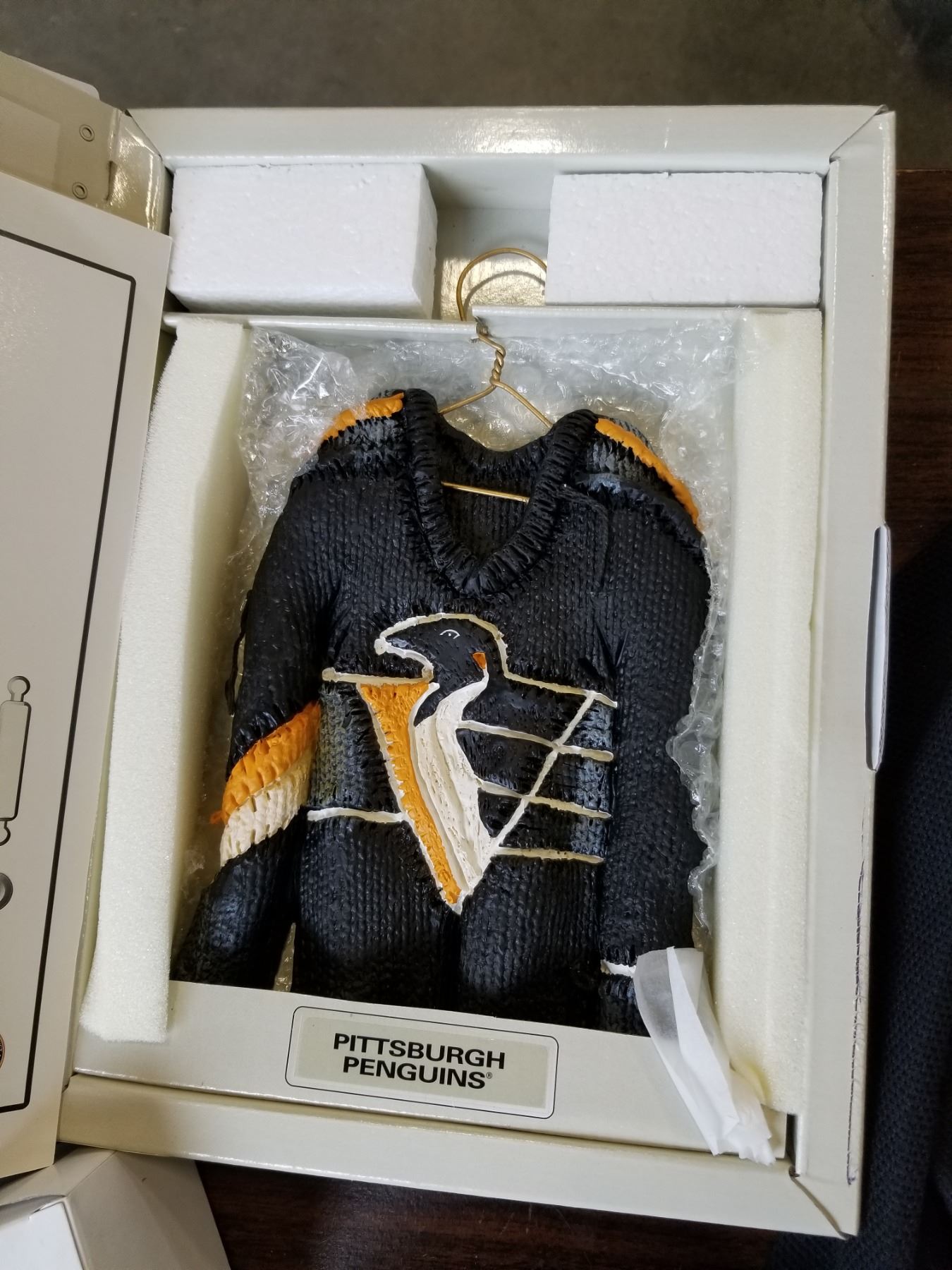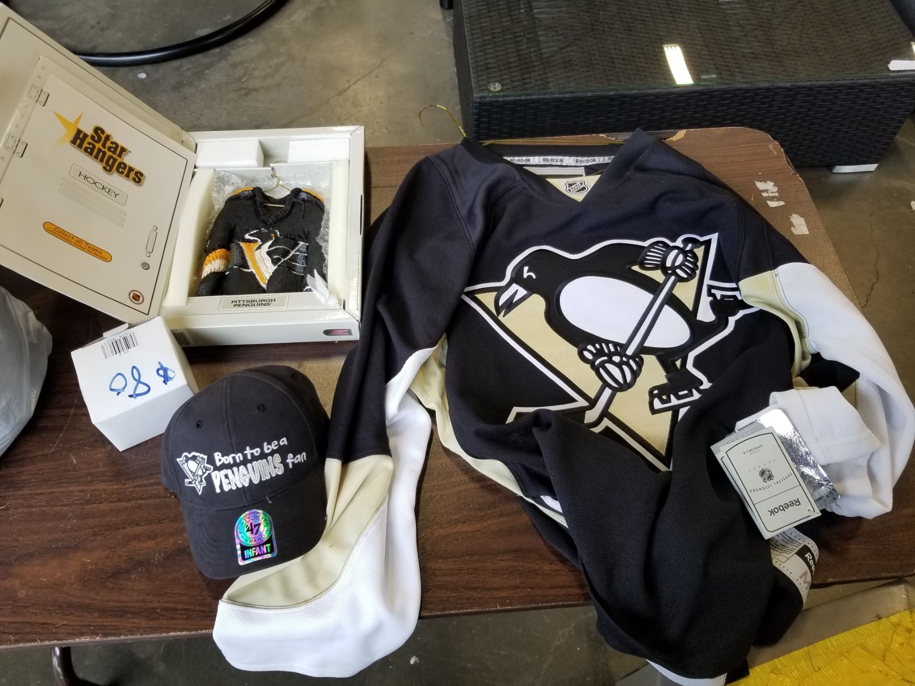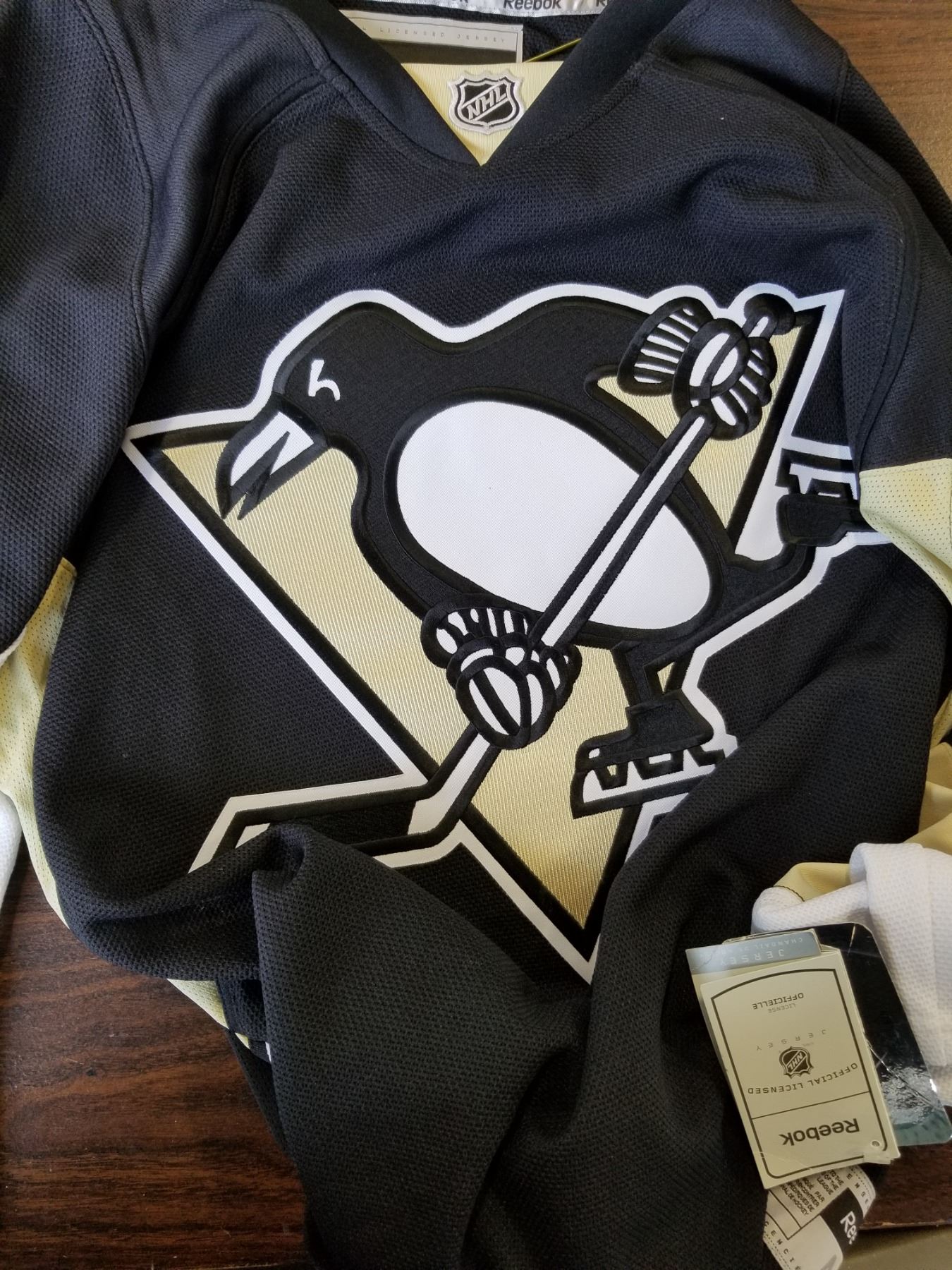 OFICIALLY LICENSED PITTSBURGH PENGUINS REEBOK NHL JERSEY AND STARHANGER AND CASE OF 10 FLASHING PINS AND HAT - RETAIL $300