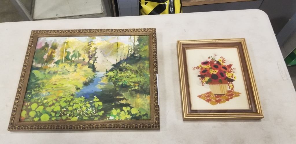 OIL ON WOOD PAINTING AND FRAMED NEEDLE POINT