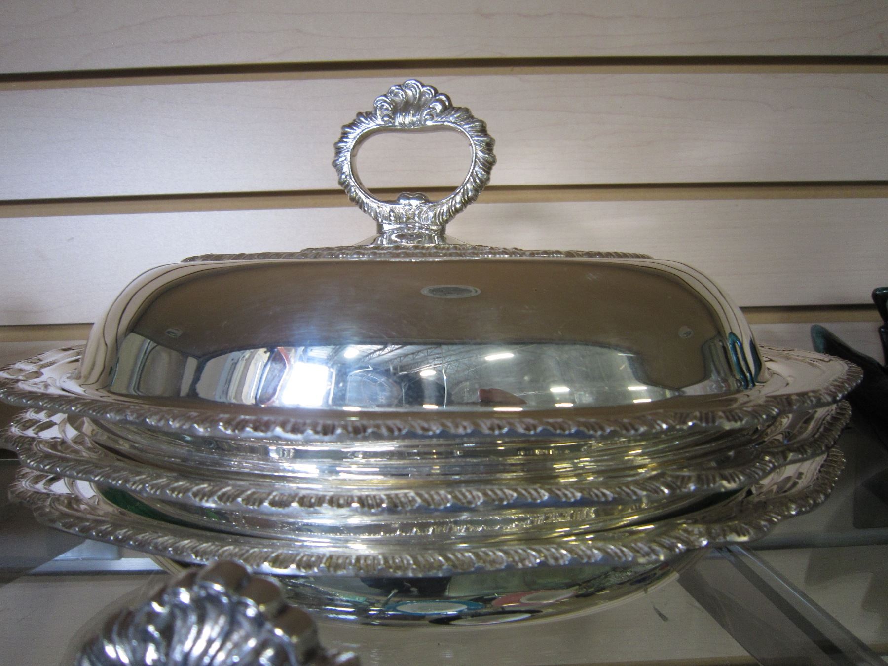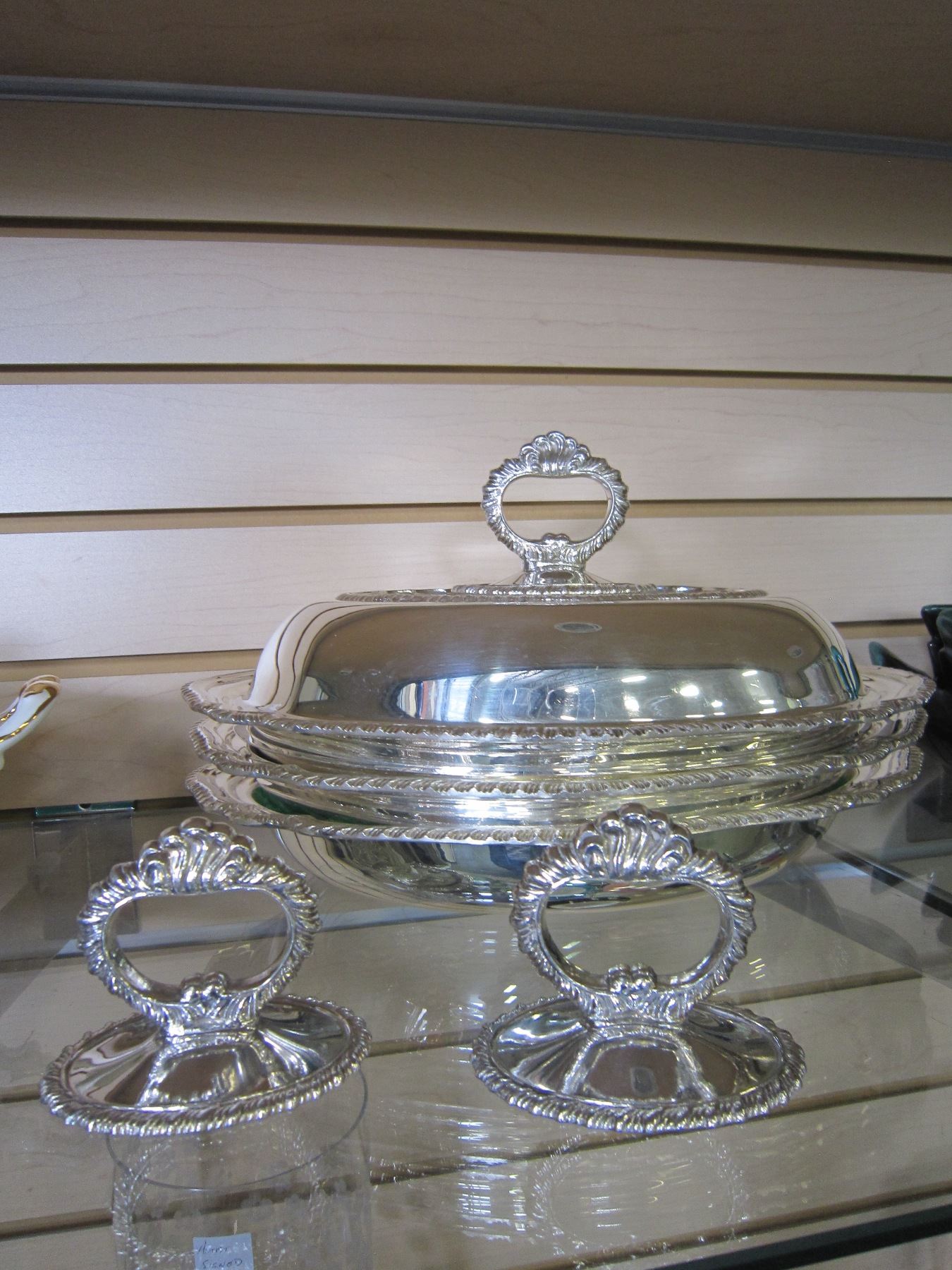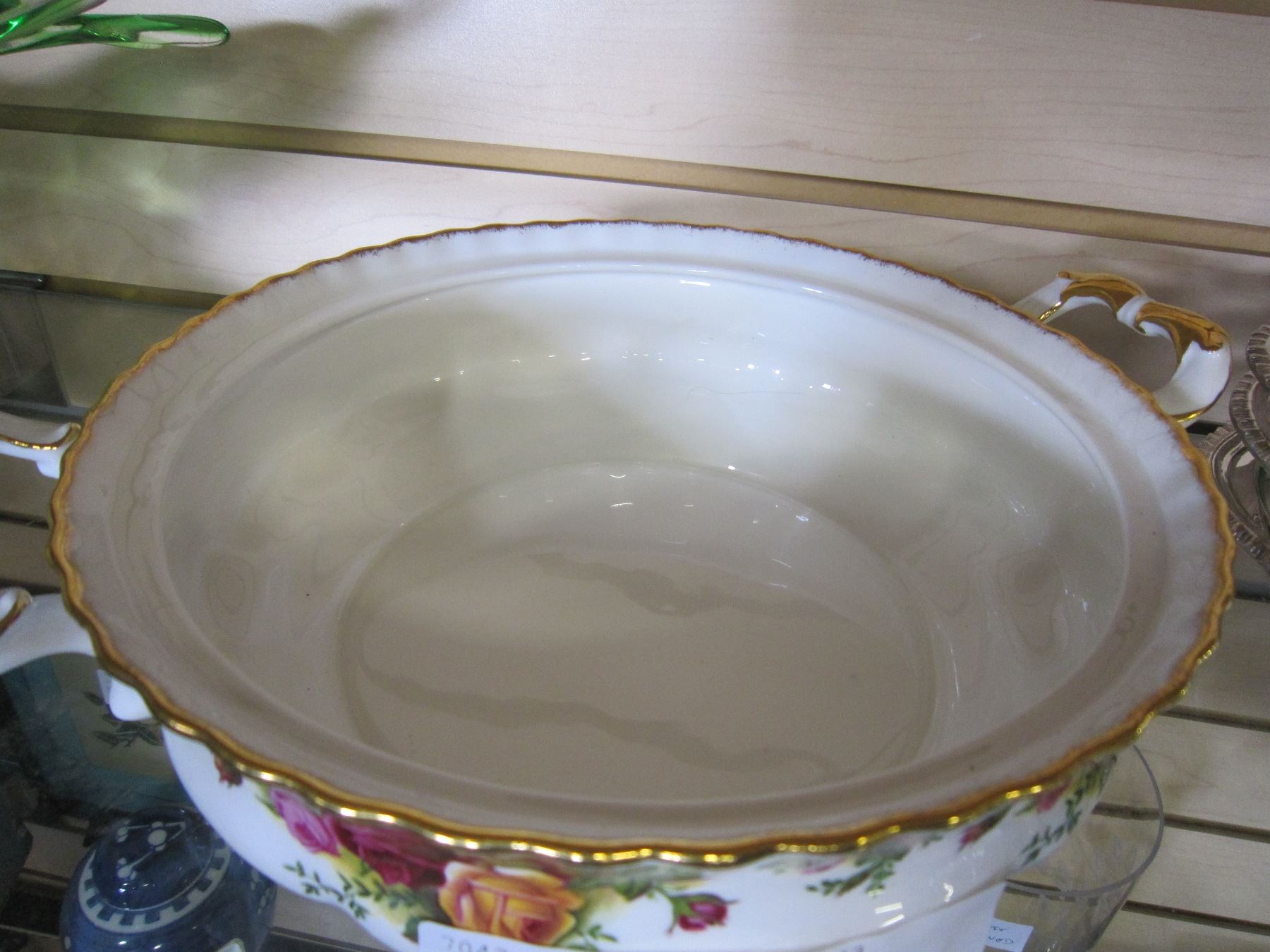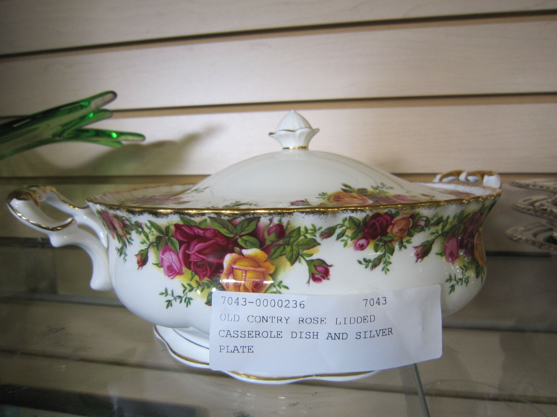 OLD CONTRY ROSE LIDDED CASSEROLE DISH AND SILVER PLATE