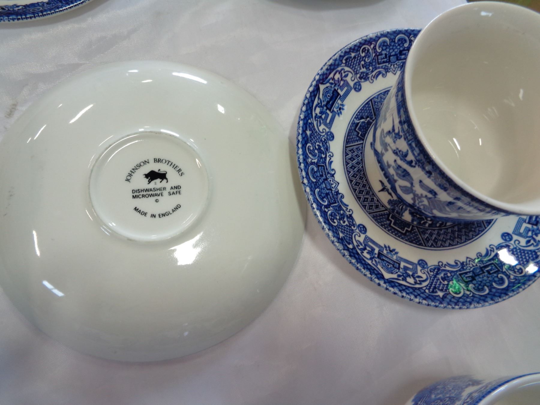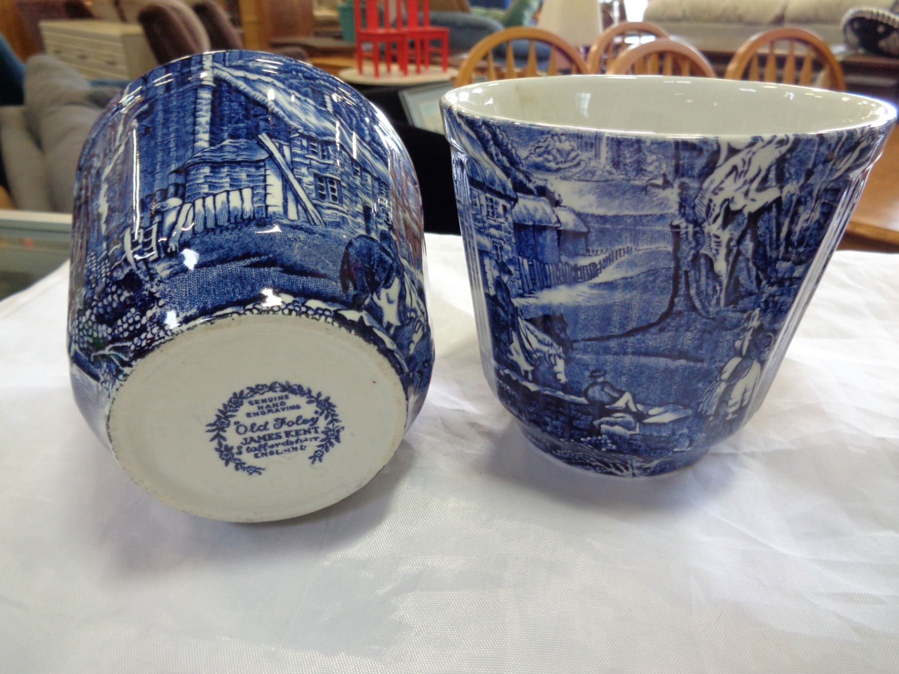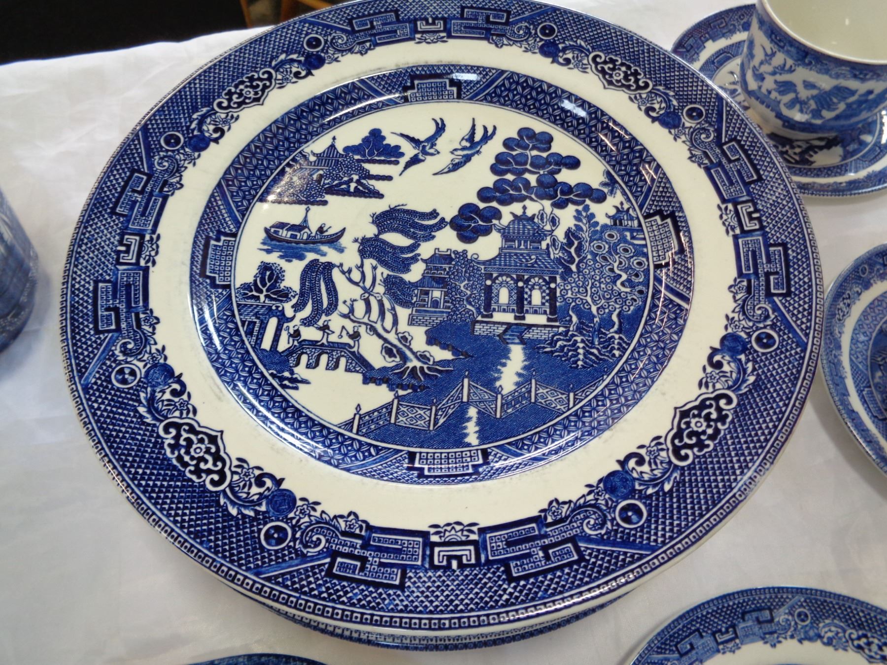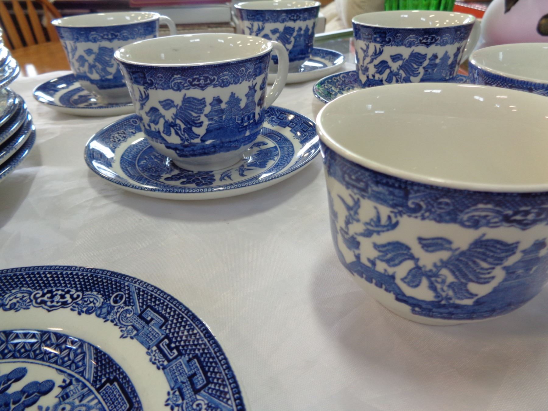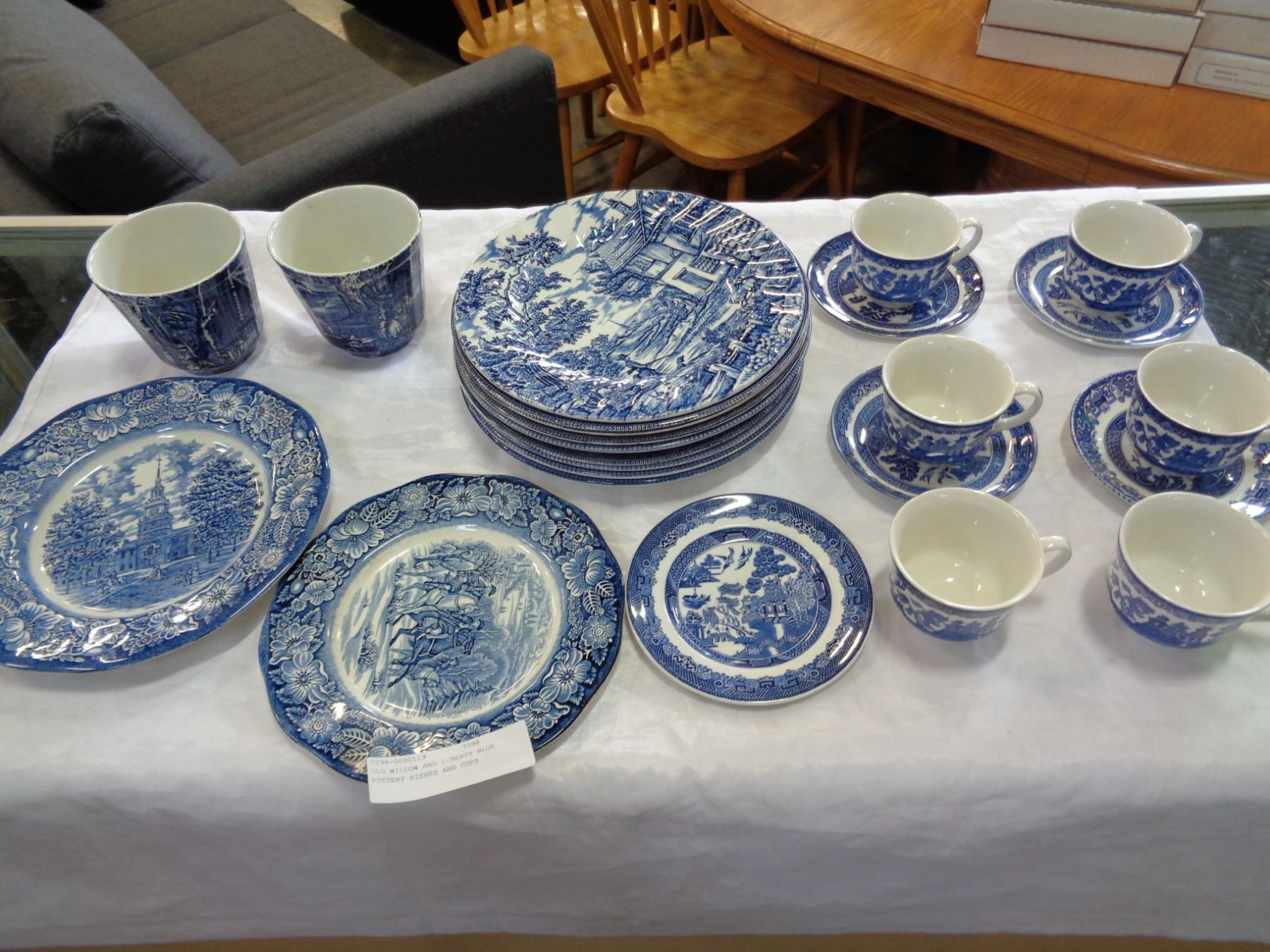 OLD WILLOW AND LIBERTY BLUE POTTERY DISHES AND CUPS - 24 PIECES TOTAL