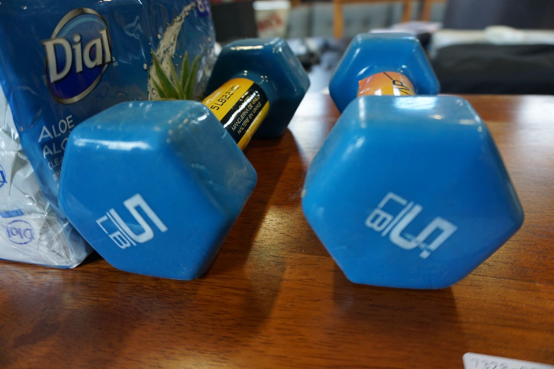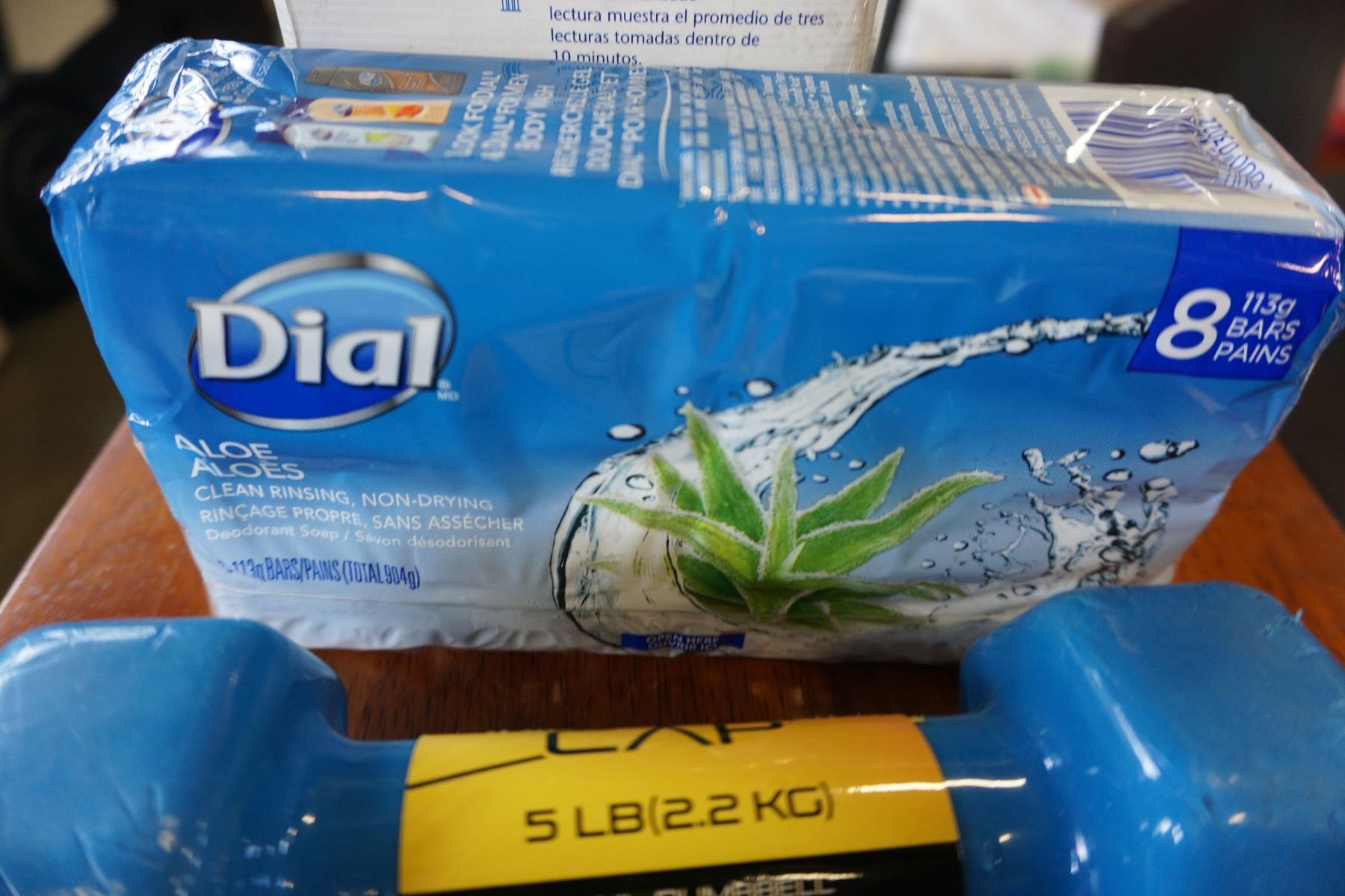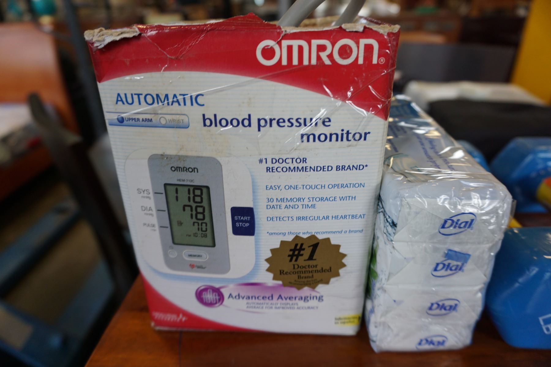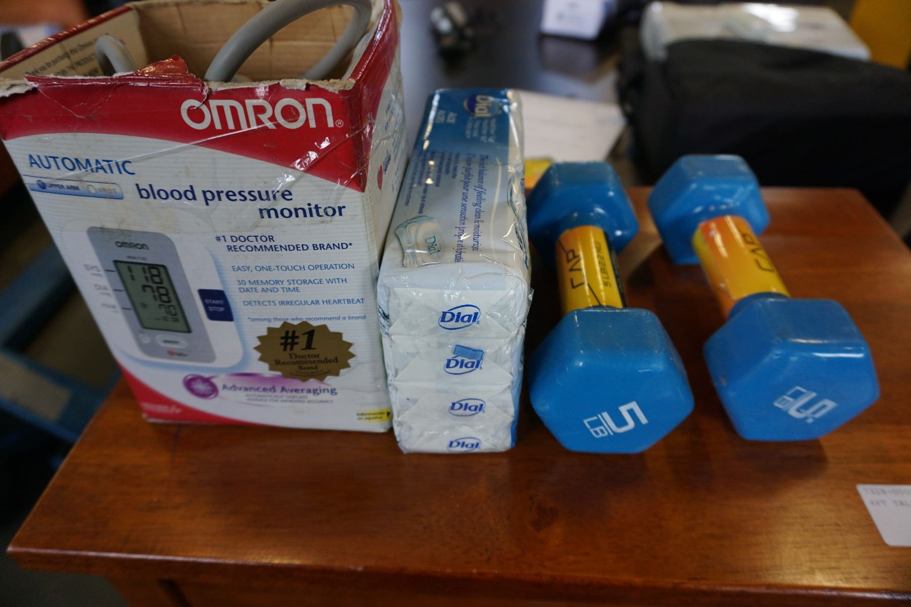 OMRON AUTOMATIC BLOOD PRESSURE MONITOR AND 2 5LB VINYL DUMBELLS AND PACK OF DIAL SOAP