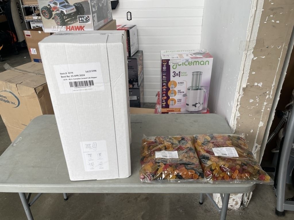 ONE CASE OF KATHY KAYE'S CARAMEL POPCORN COB AND 2 3KG BAGS OF WINE GUMS