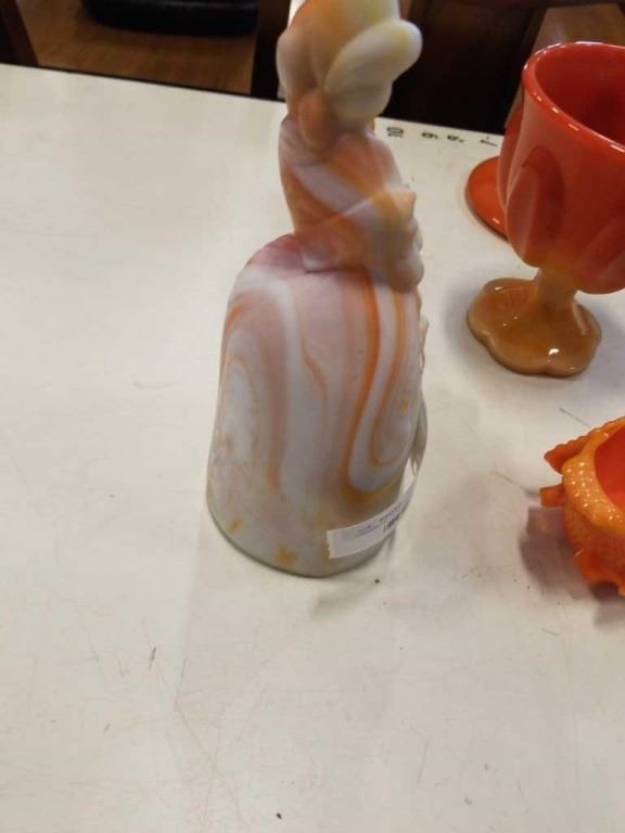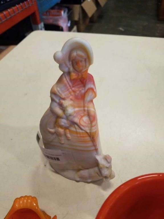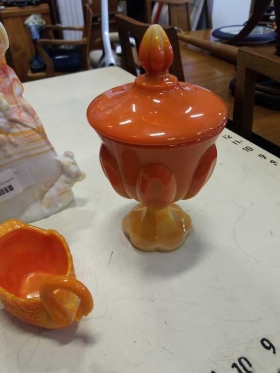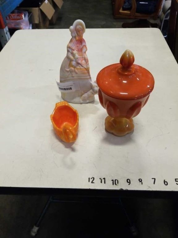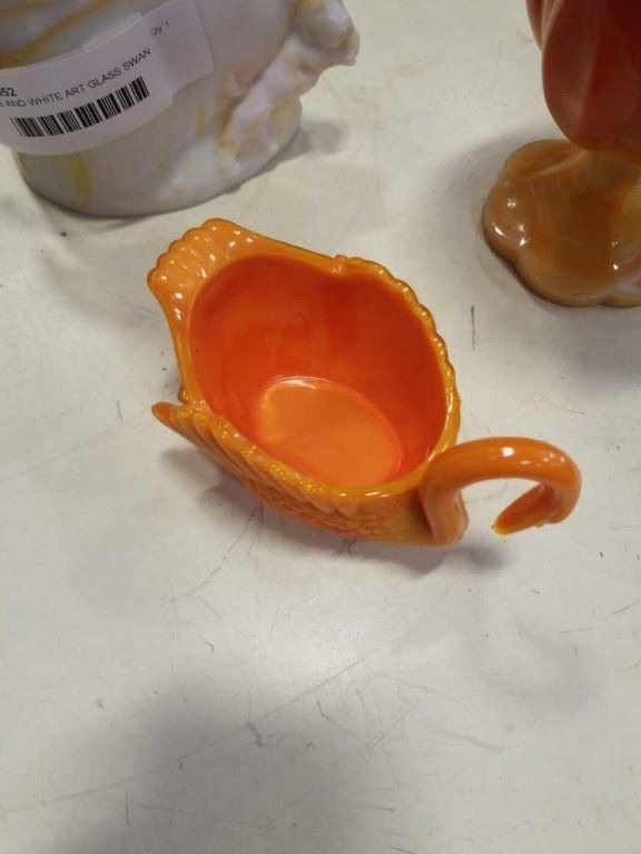 ORANGE AND WHITE ART GLASS SWAN DISH, LADY FIGURE AND LIDDED PEDESTAL DISH