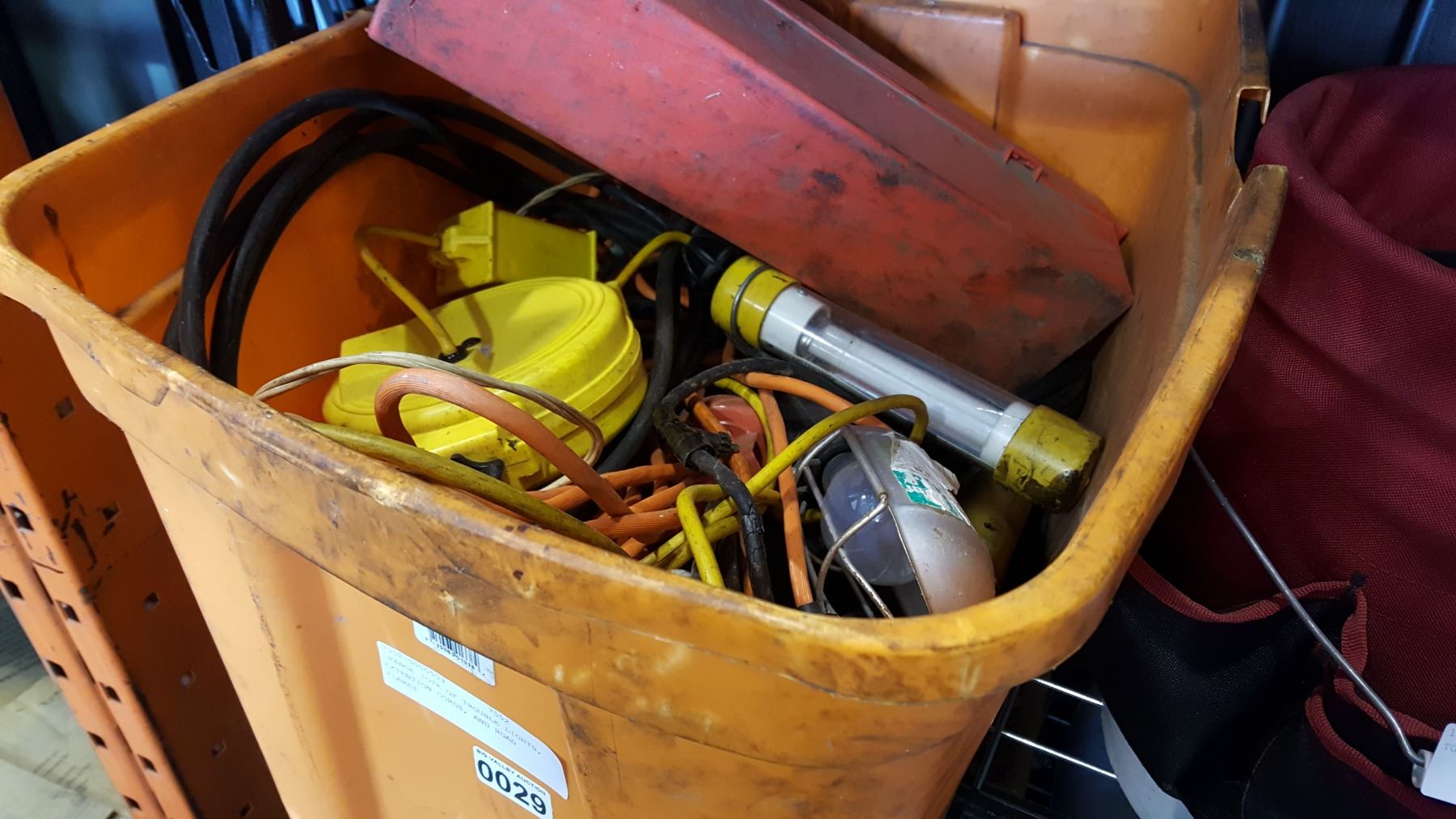 ORANGE TOTE OF TROUBLE LIGHTS, EXTENTION CORDS, AND ROAD FLARES