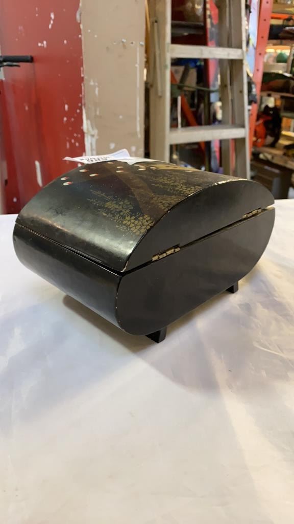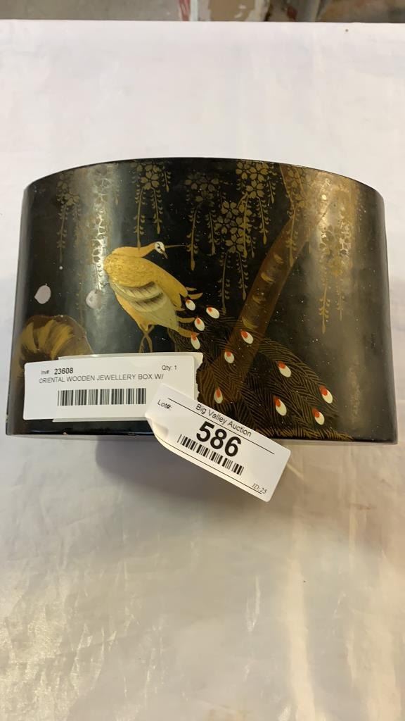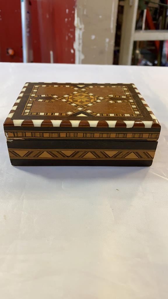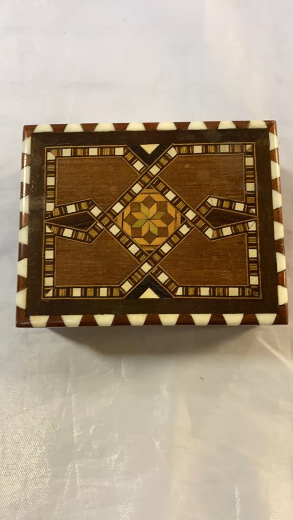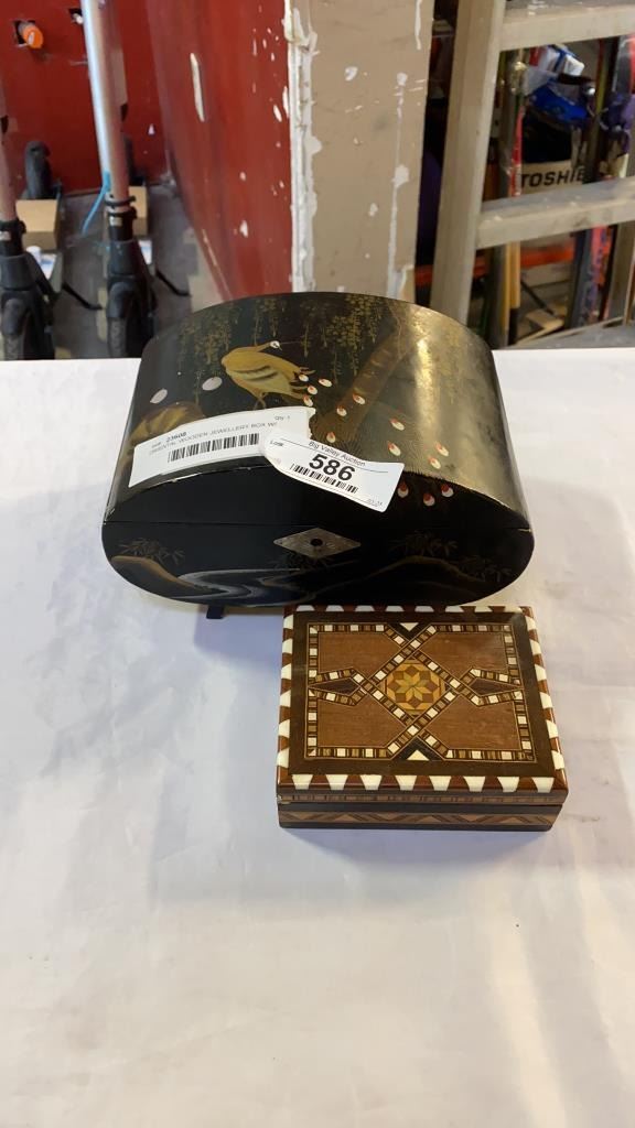 ORIENTAL WOODEN JEWELLERY BOX W/ CONTENTS AND WOODEN JEWELLEY BOX W/ CONTENTS