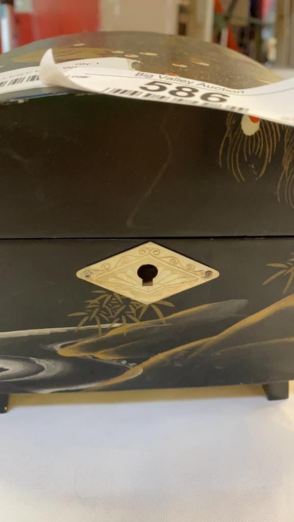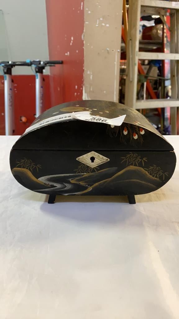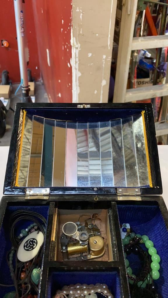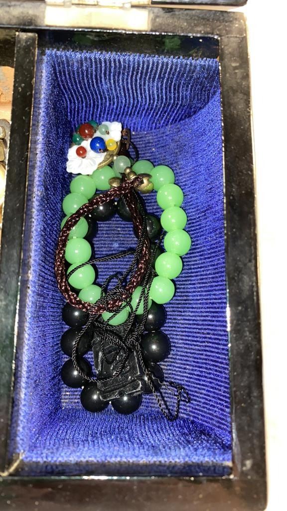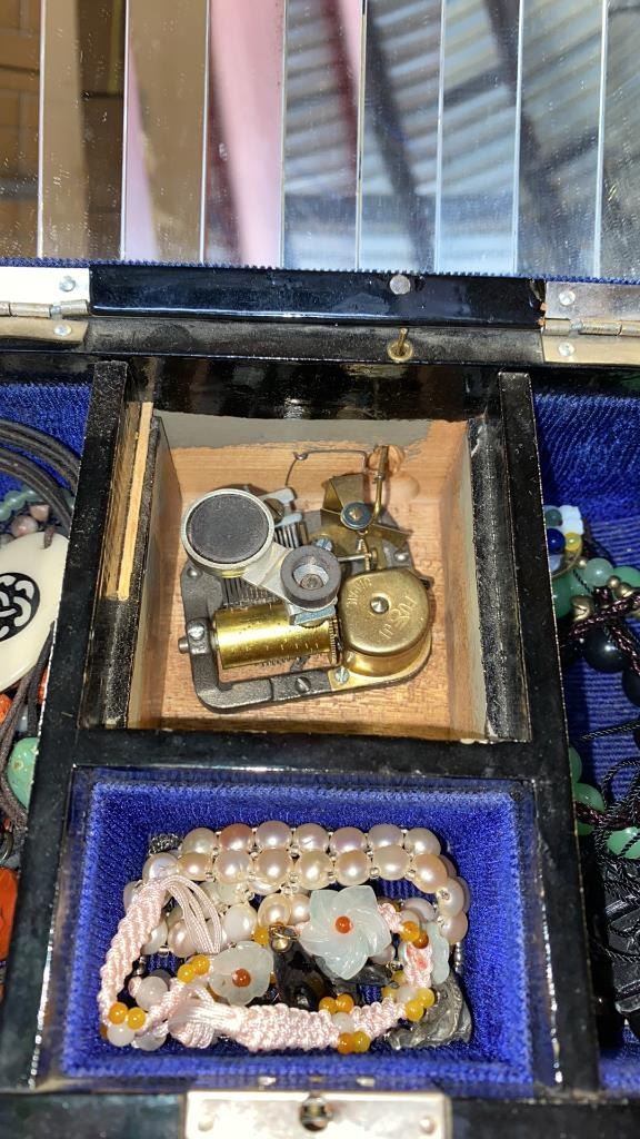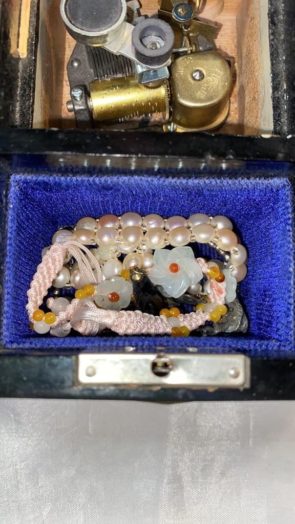 ORIENTAL WOODEN JEWELLERY BOX W/ CONTENTS AND WOODEN JEWELLEY BOX W/ CONTENTS