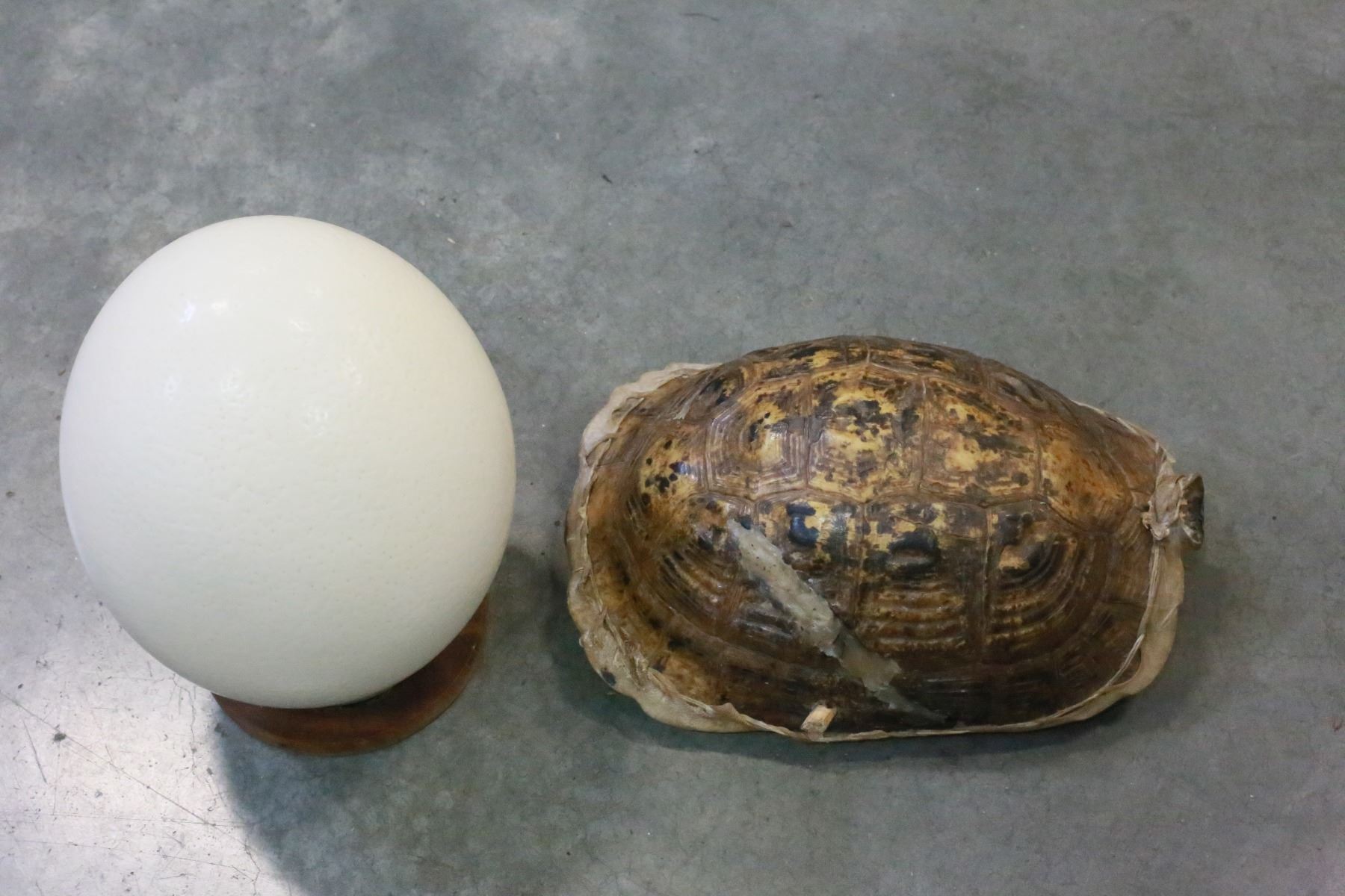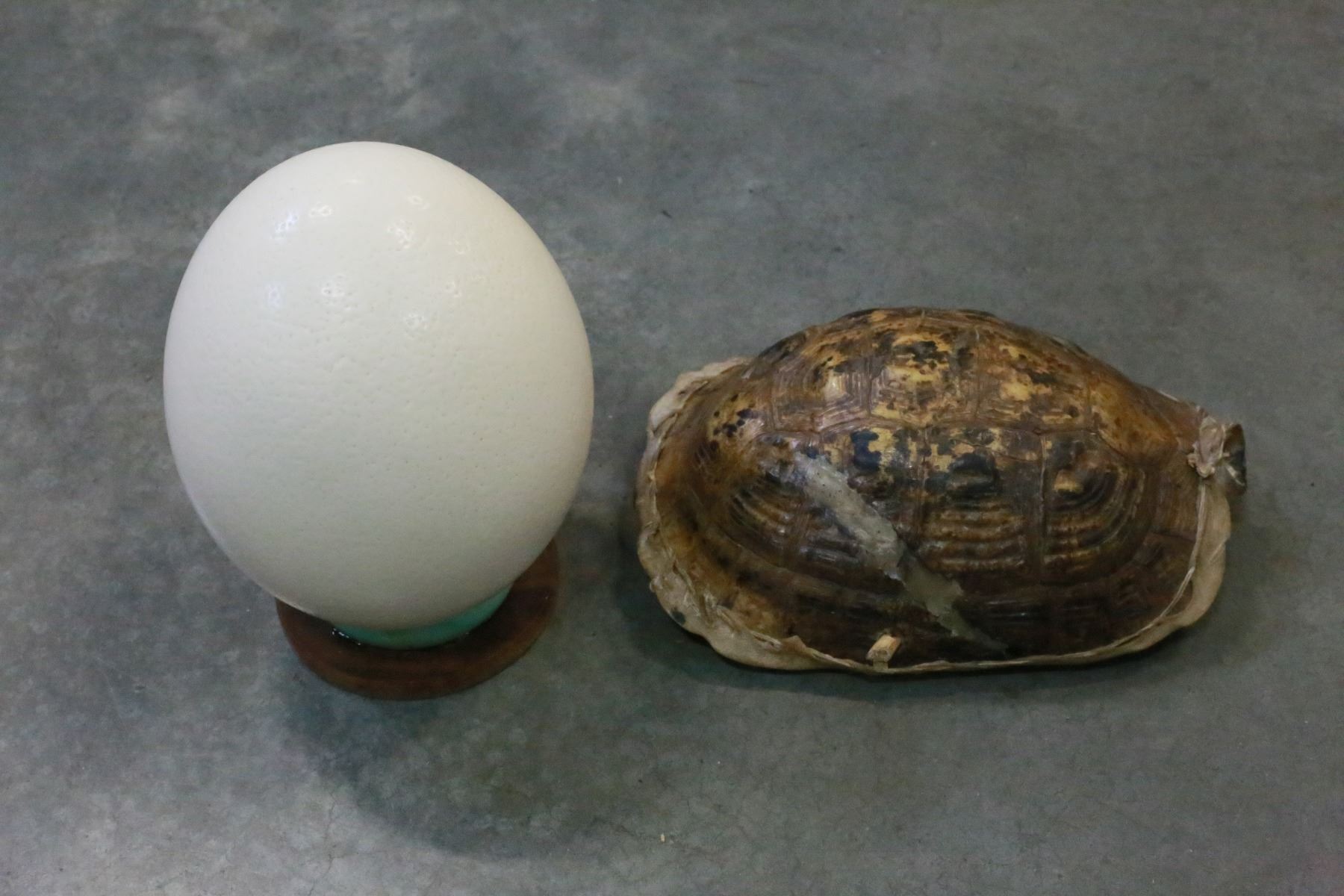 OSTRICH EGG ON STAND AND TURTOISE SHELL