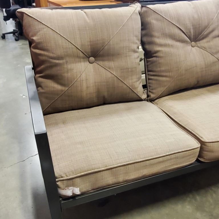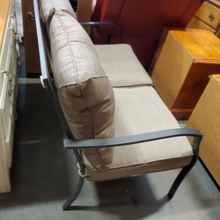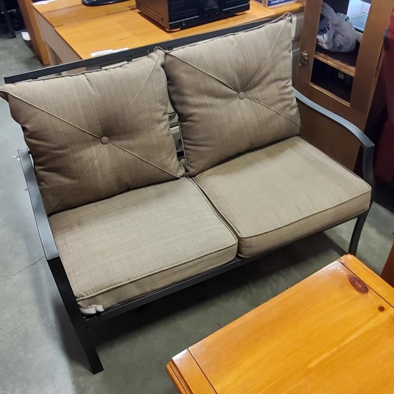 OUTDOOR 2 SEATER PATIO SOFA W/ METAL FRAME AND GREY CUSHIONS