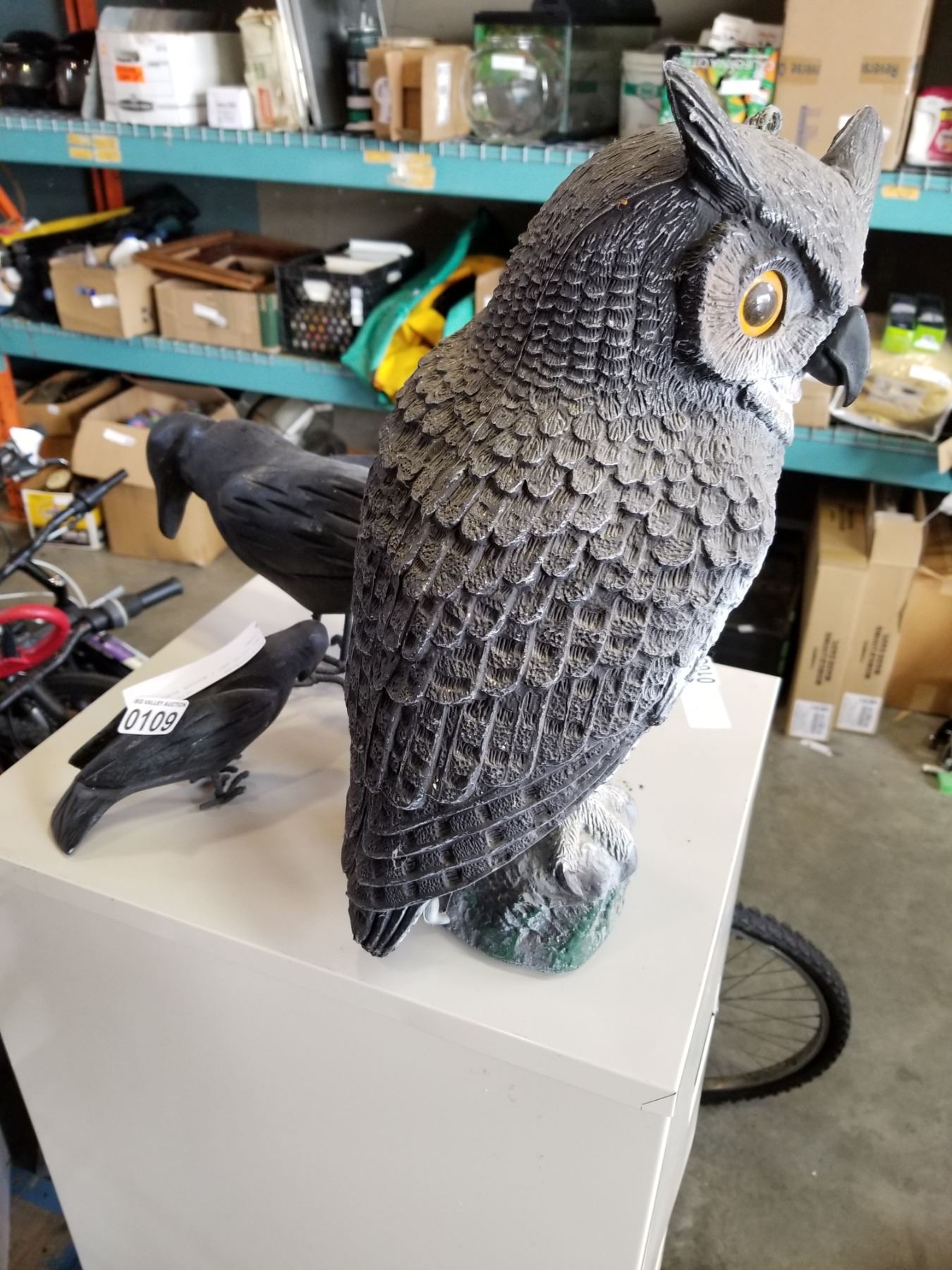 OWL DECOY AND 2 WOODEN BLACK CROWS