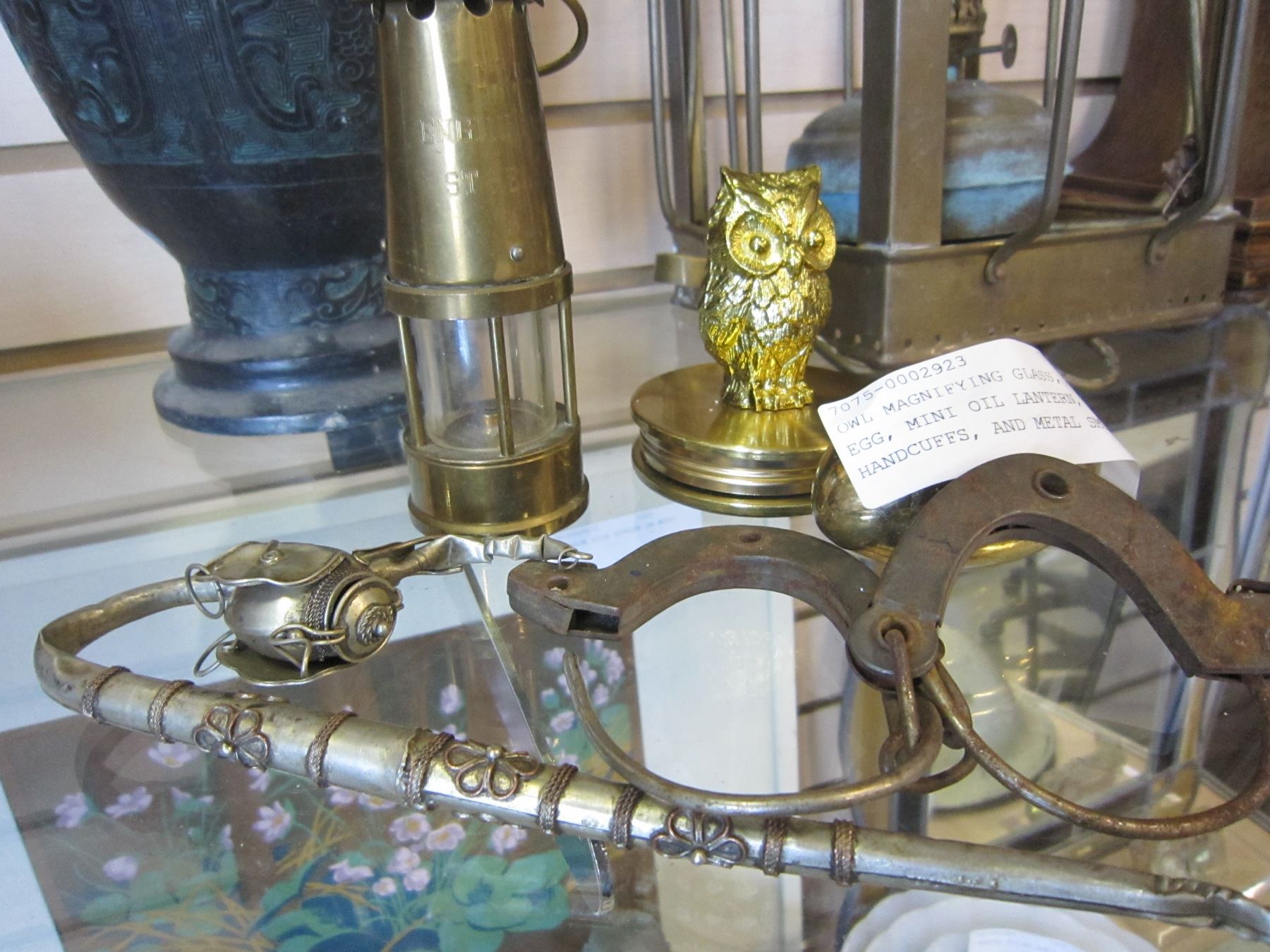 OWL MAGNIFYING GLASS, BRASS EGG, MINI OIL LANTERN, HANDCUFFS, AND METAL SMOKING PIPE