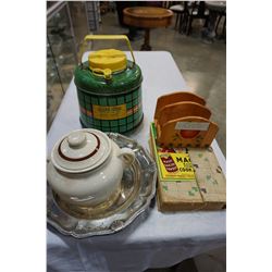 CAPE COD PICNIC JUG, STONE WARE CROCK, SILVER PLATE TRAY, ANTIQUE RECIPES, AND S AND P TRAY