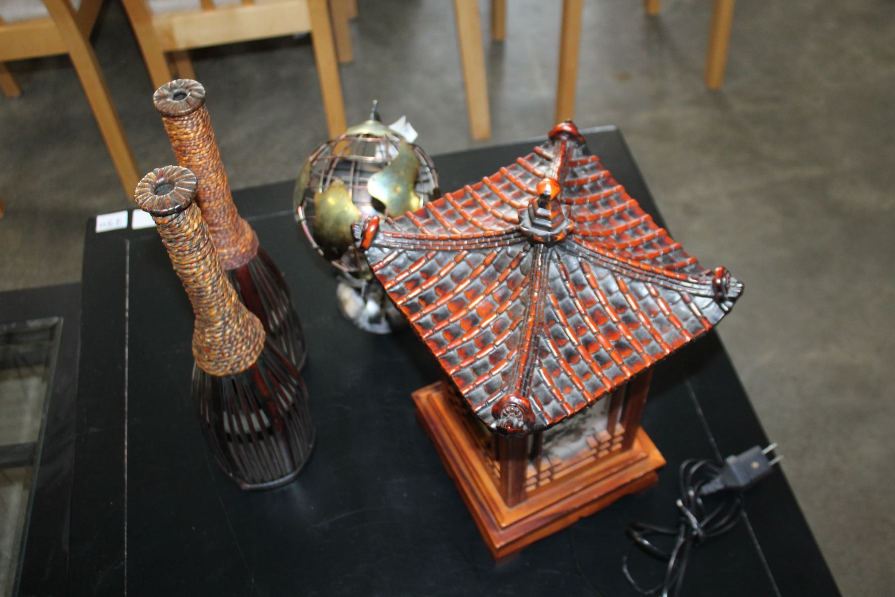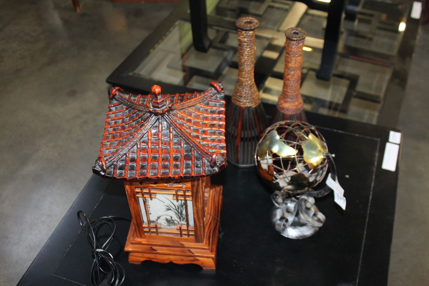 PAGODA STYLE LAMP AND DECORATIVE METAL GLOBE AND CANDLESTICKS