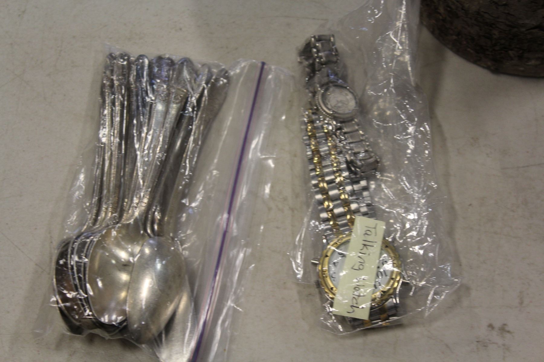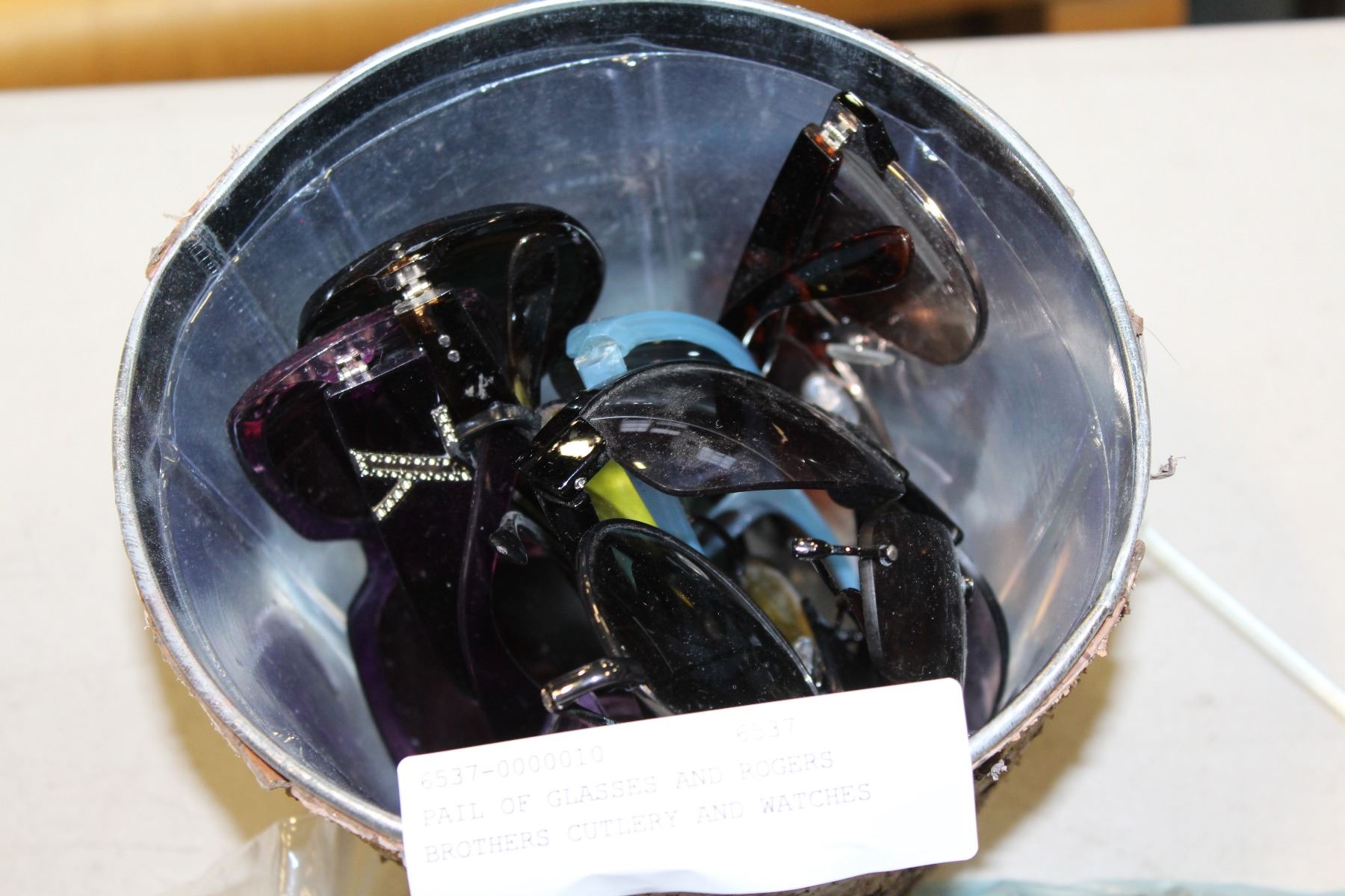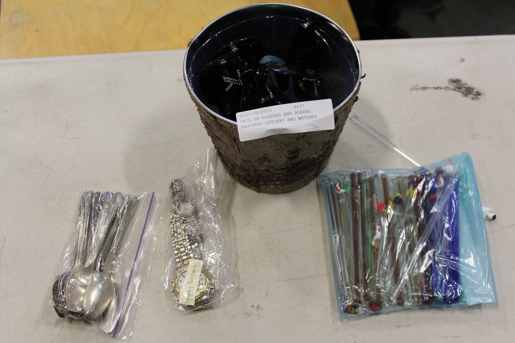 PAIL OF GLASSES AND ROGERS BROTHERS CUTLERY AND WATCHES
