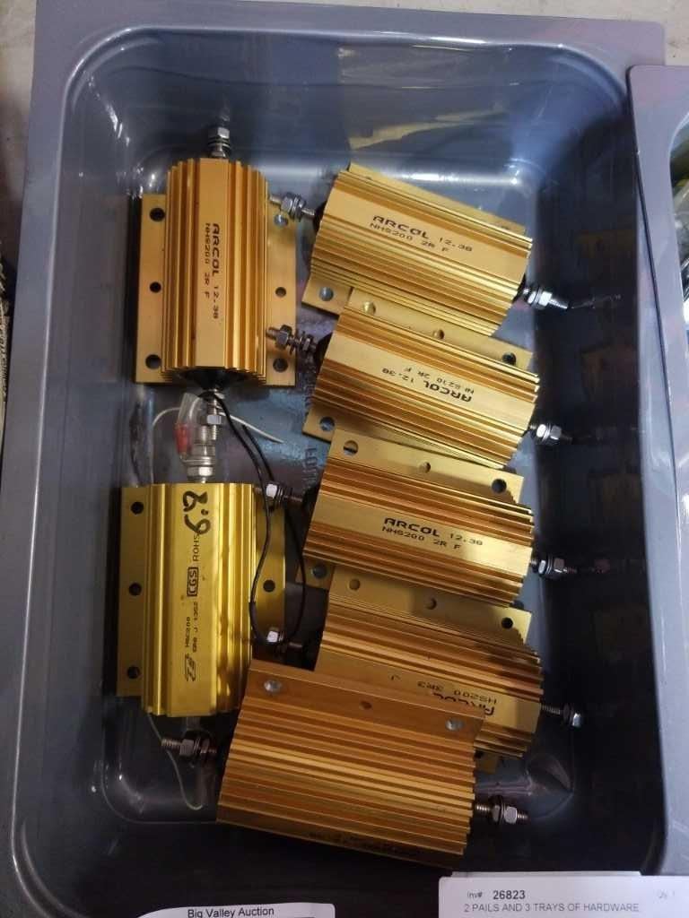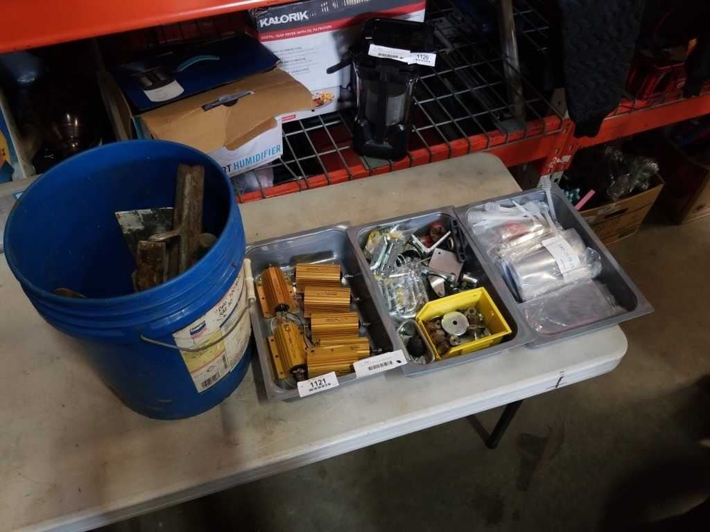 PAILS AND 3 TRAYS OF HARDWARE, TROWELS, ELECTRICAL