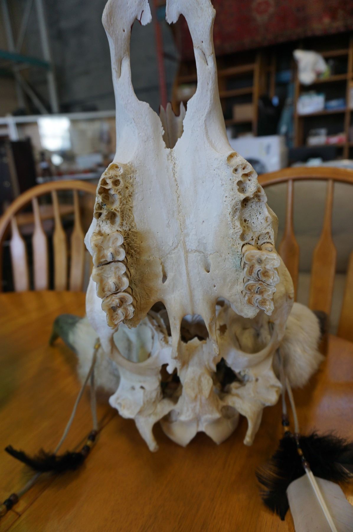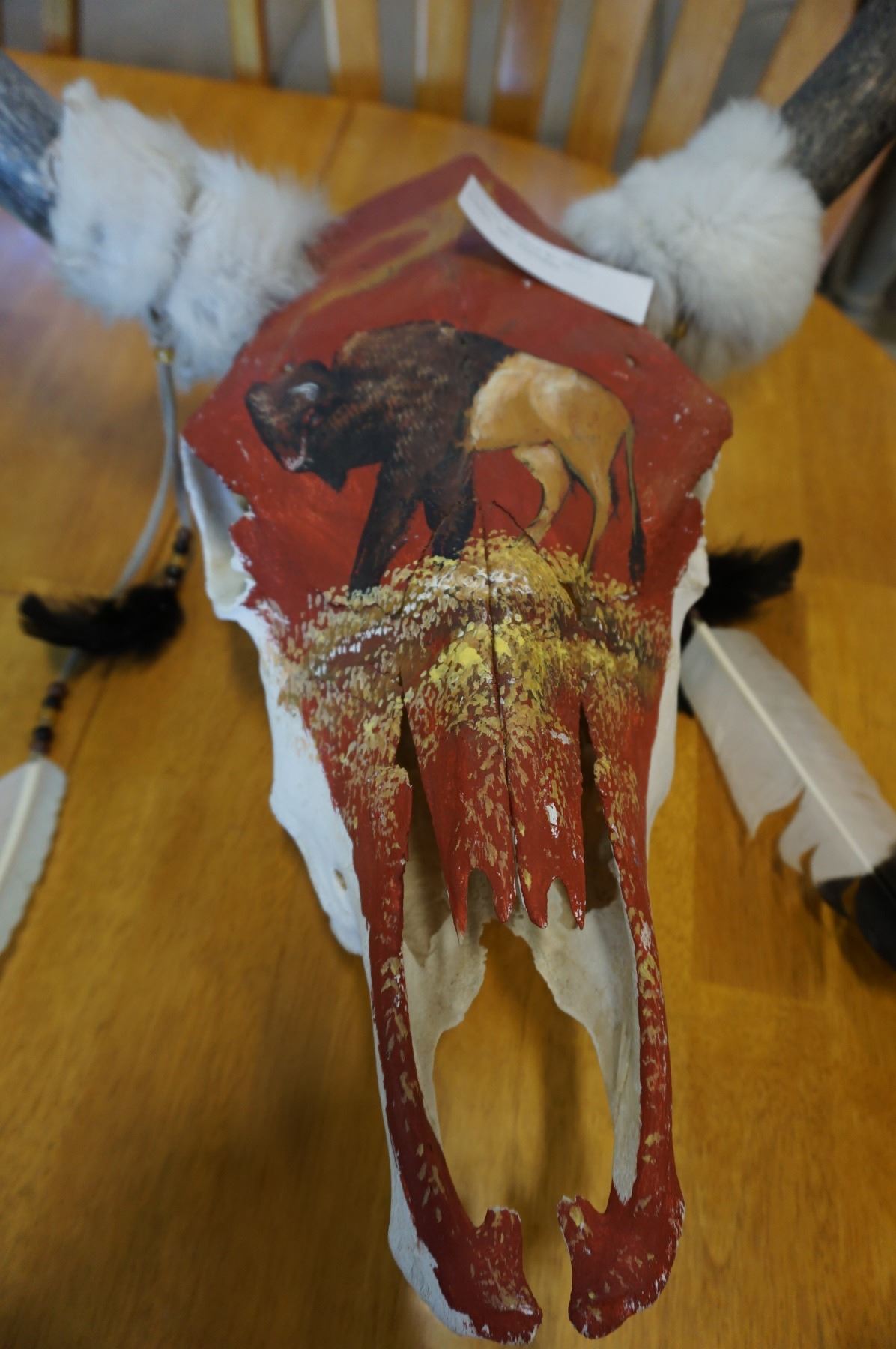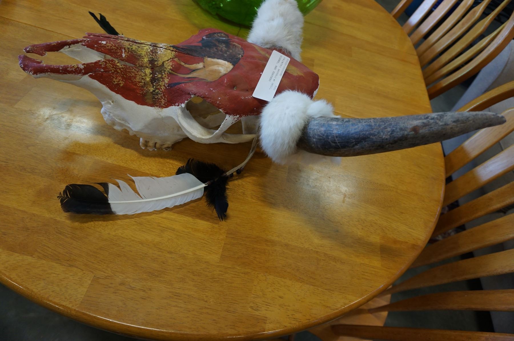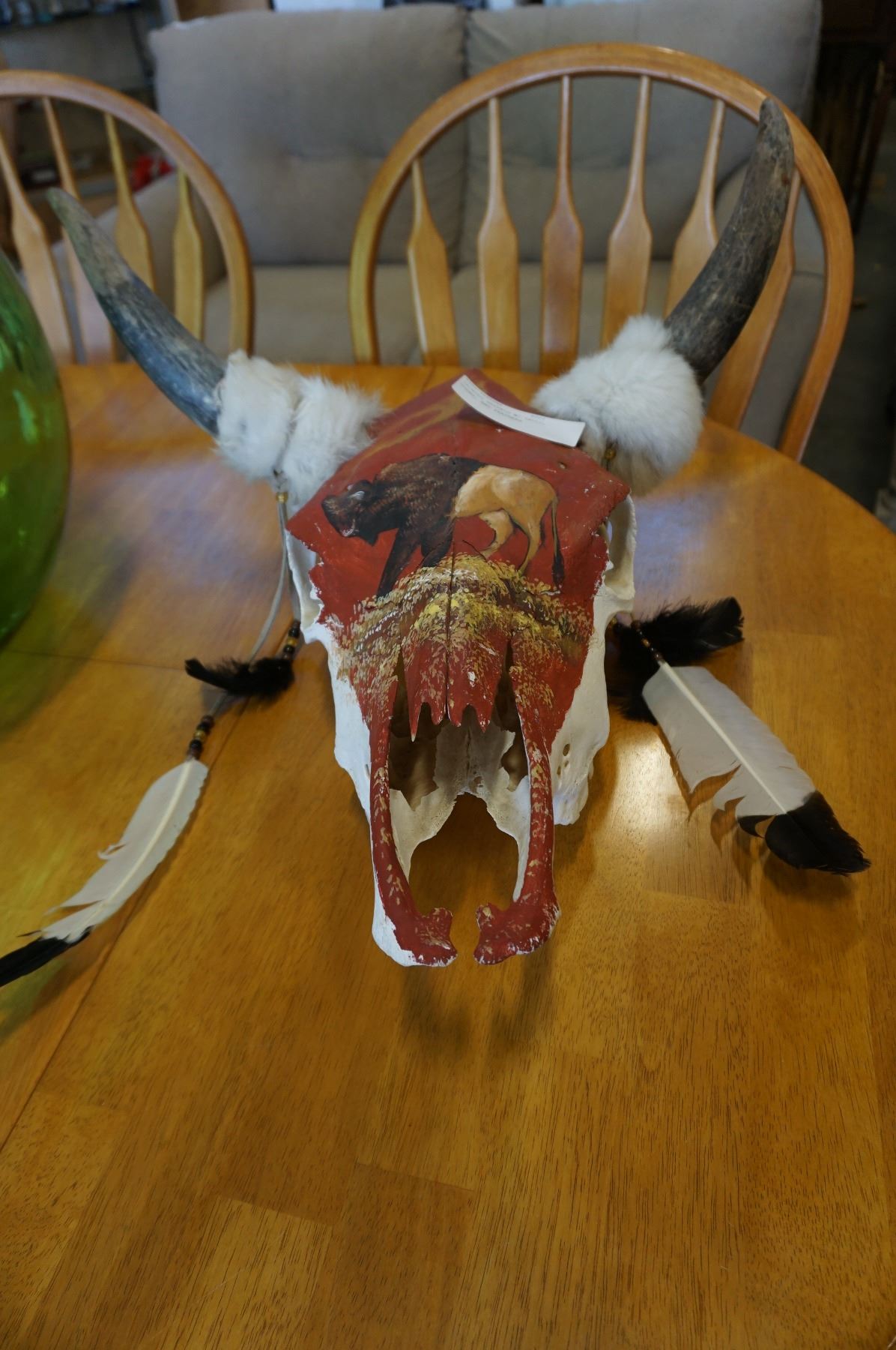 PAINTED BAFFALO W/ SKULL, HORNS, AND FEATHERS