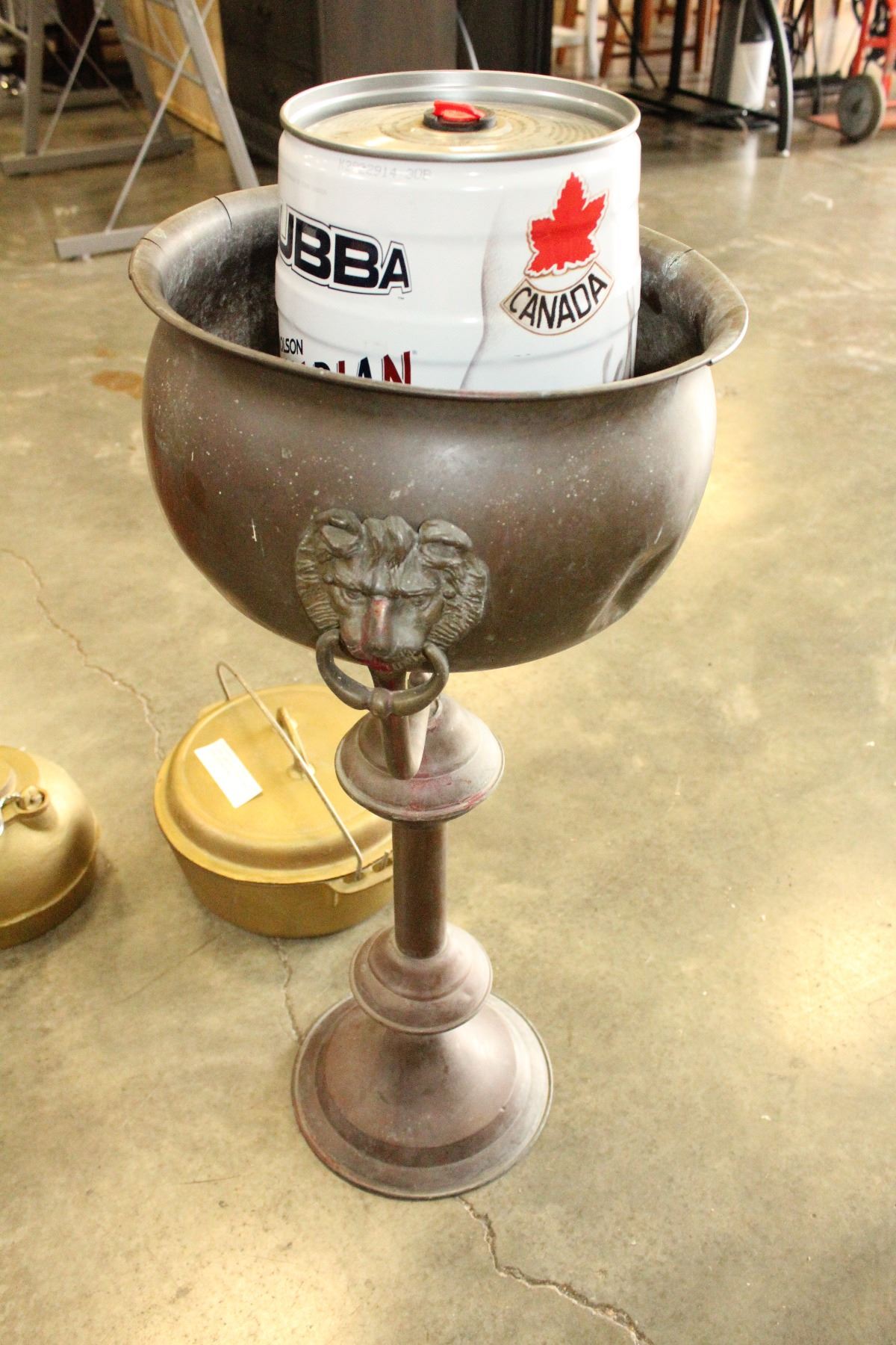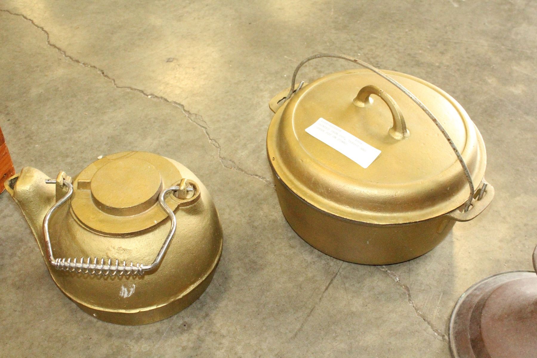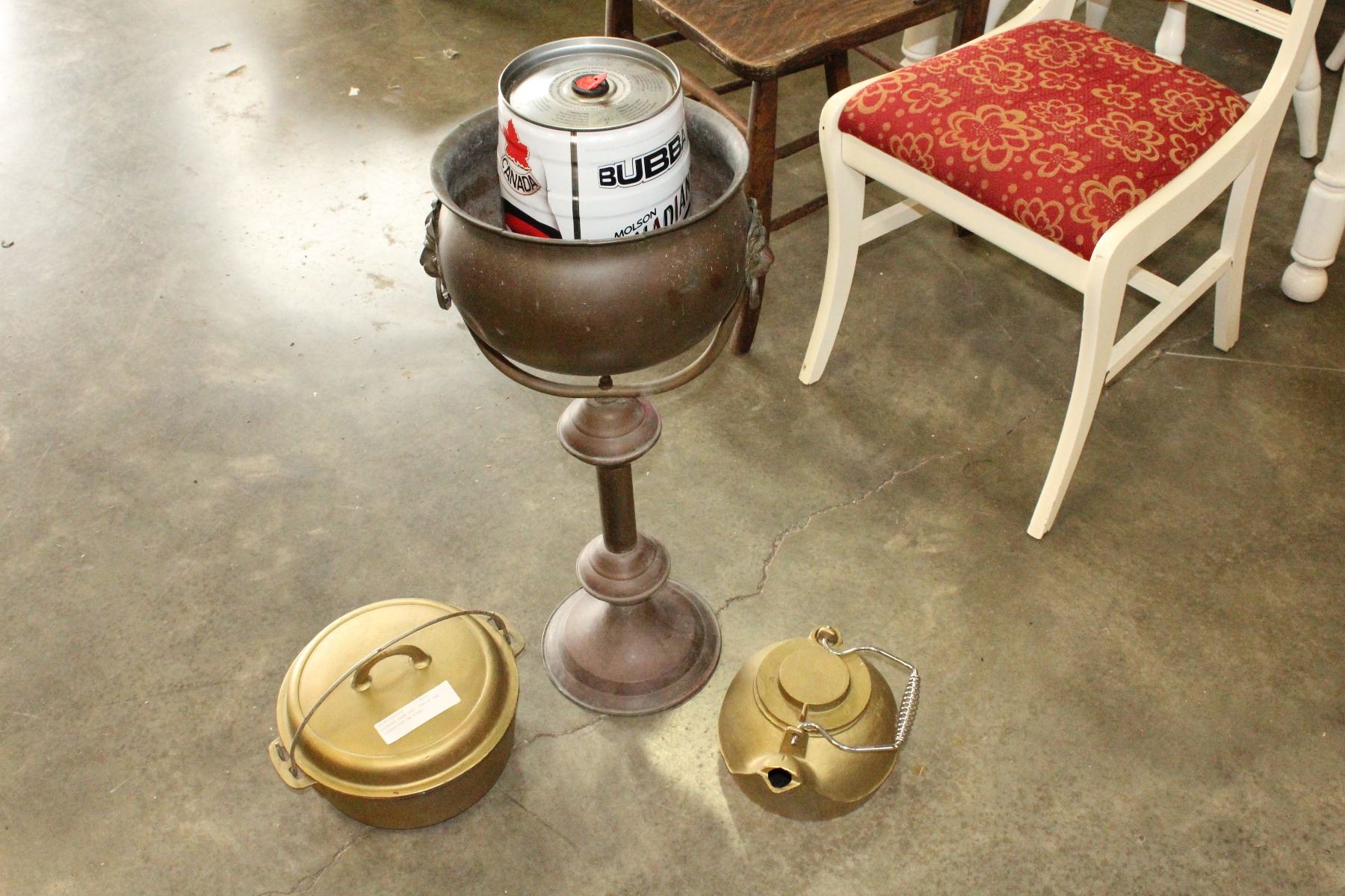 PAINTED IRON POT, TEAPOT AND COPPER POT ON STAND