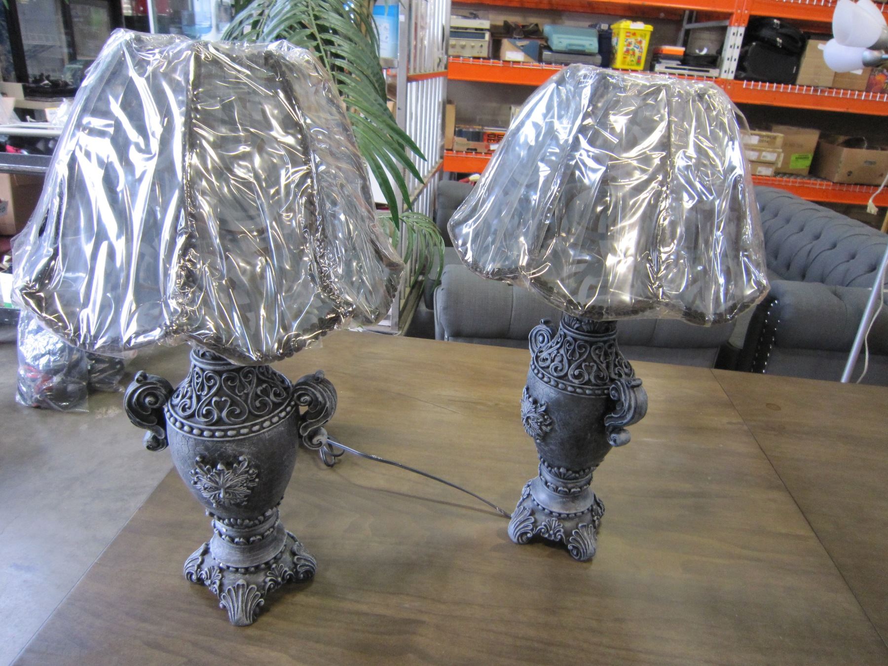 PAIR OF 2 BLACK CARVED RESIN LAMPS, WITH LION ACCENTS