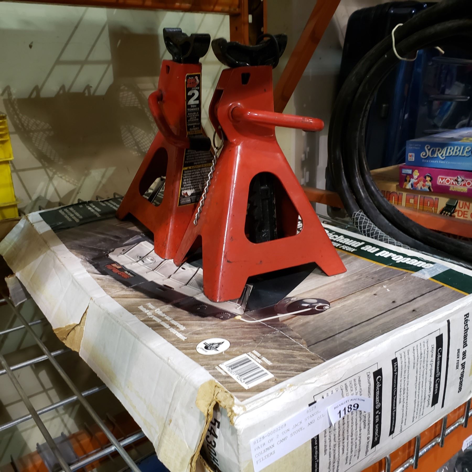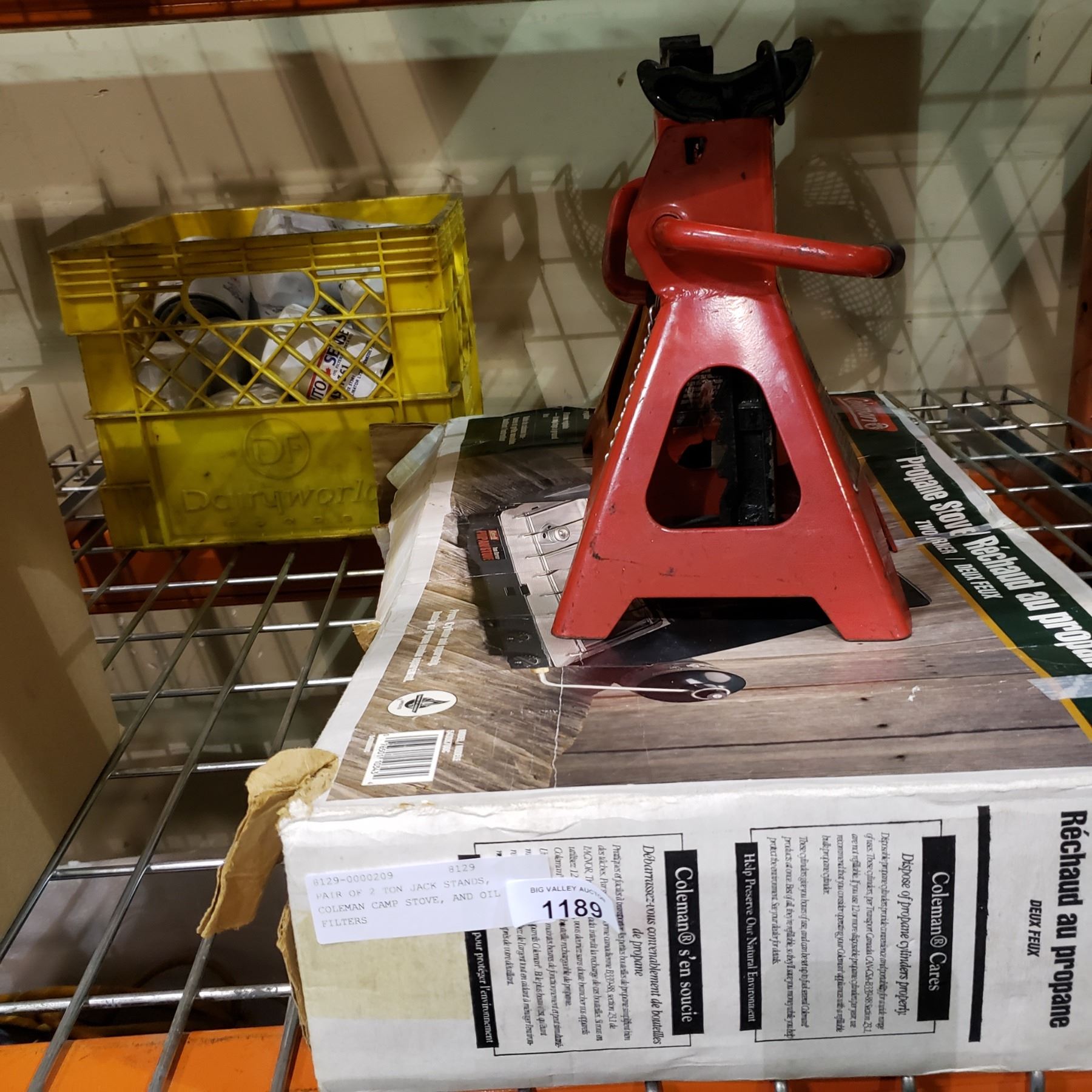 PAIR OF 2 TON JACK STANDS, COLEMAN CAMP STOVE, AND OIL FILTERS