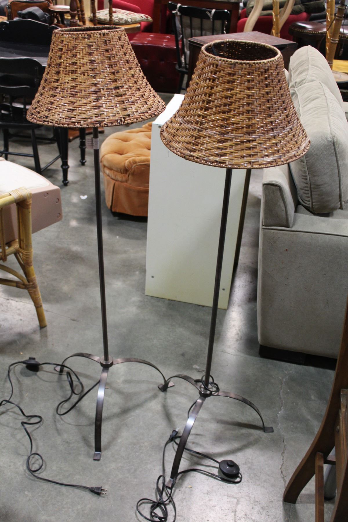 PAIR OF 50 INCH METAL BASE FLOOR LAMPS WITH ADJUSTABLE RATTAN SHADE