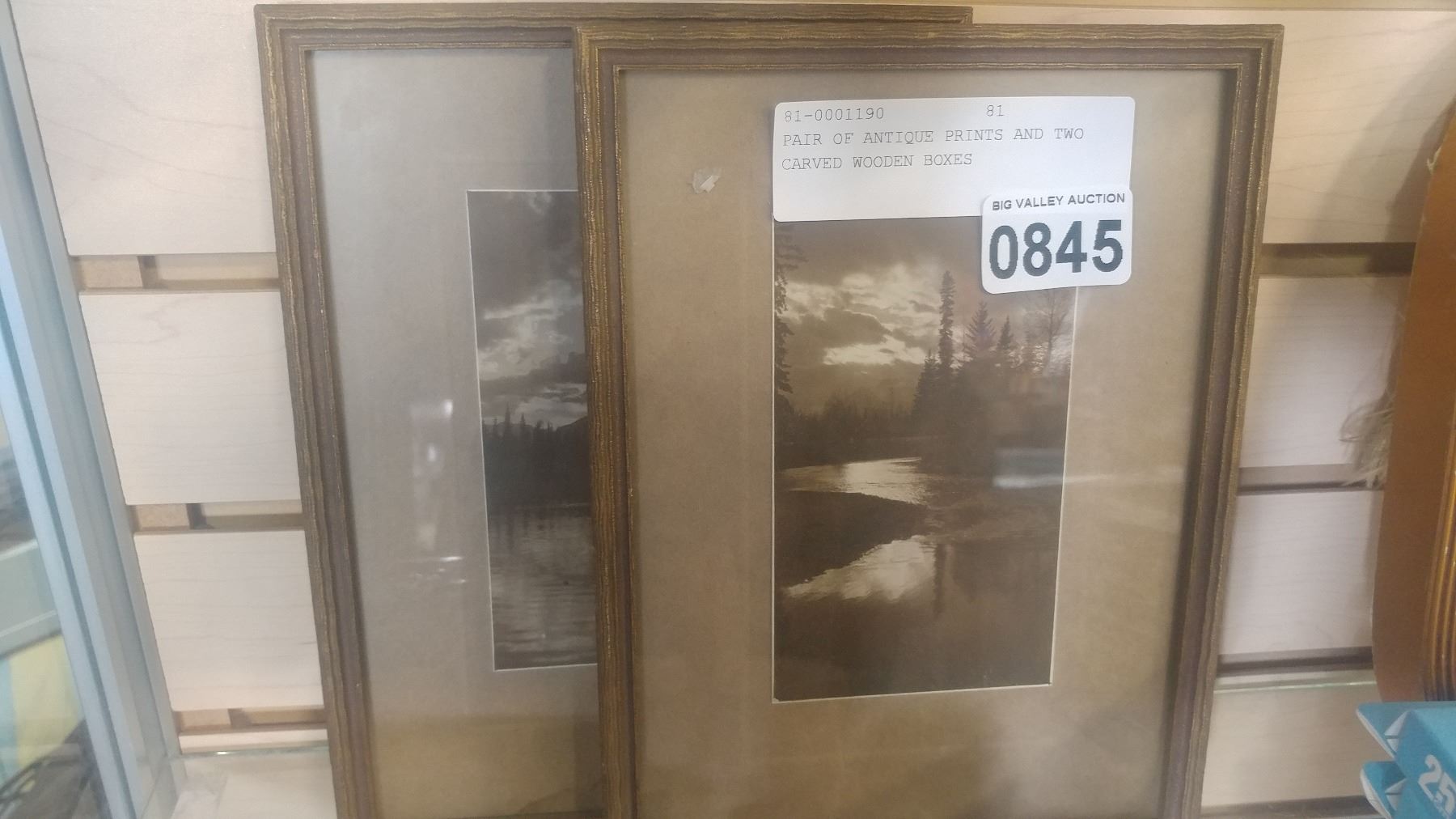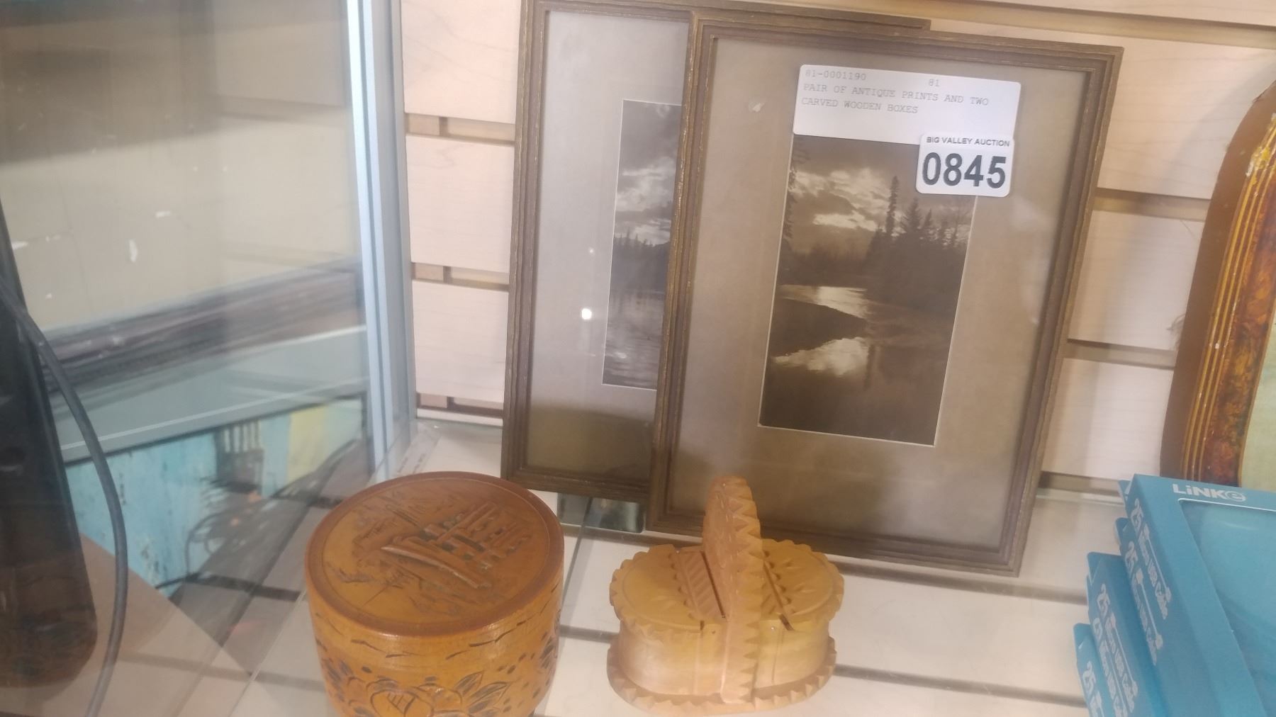 PAIR OF ANTIQUE PRINTS AND TWO CARVED WOODEN BOXES
