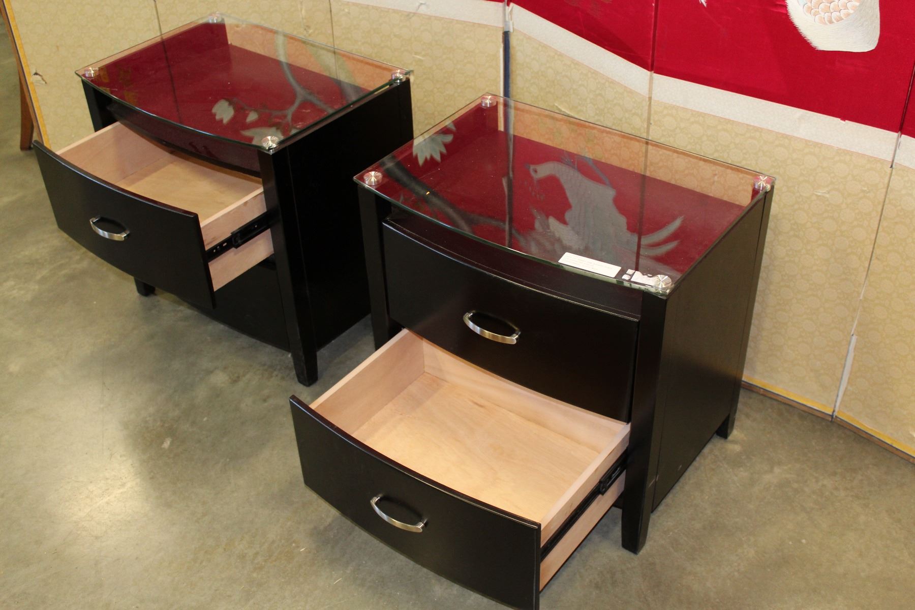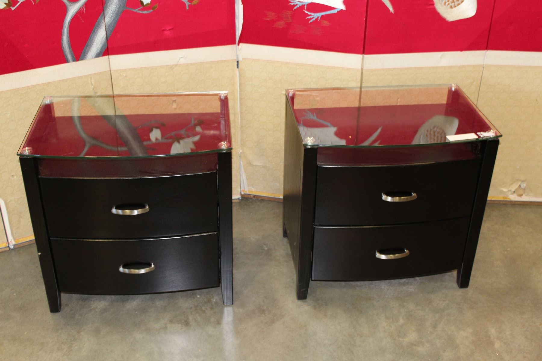 PAIR OF BRAND NEW MODERN GLASS TOP ESPRESSO FINISH NIGHTSTANDS, SOLID WOOD CONSTRUCTION, BALL BEARING DRAWER SLIDES RETAIL $349ea.