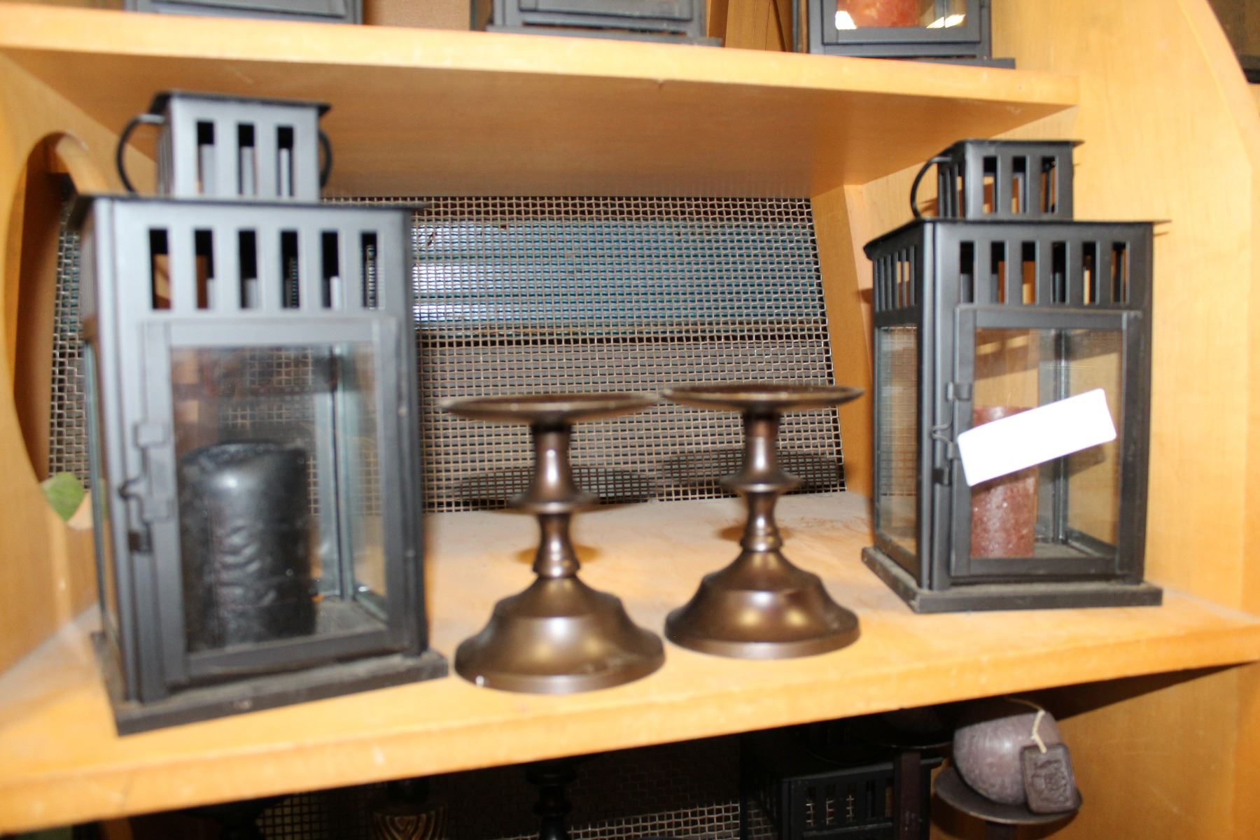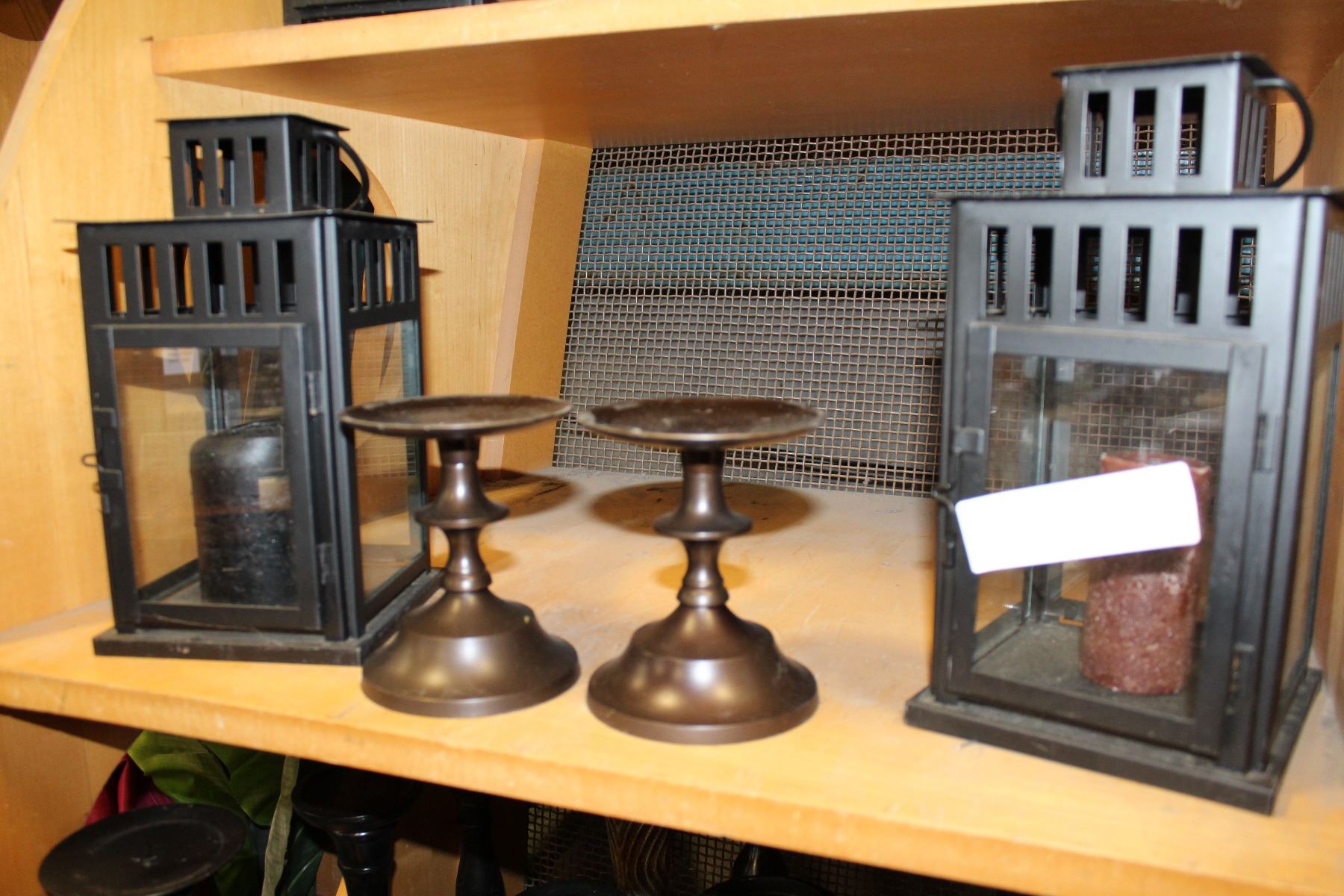 PAIR OF CANDLE LANTERNS AND PAIR OF METAL CANDLESTICKS
