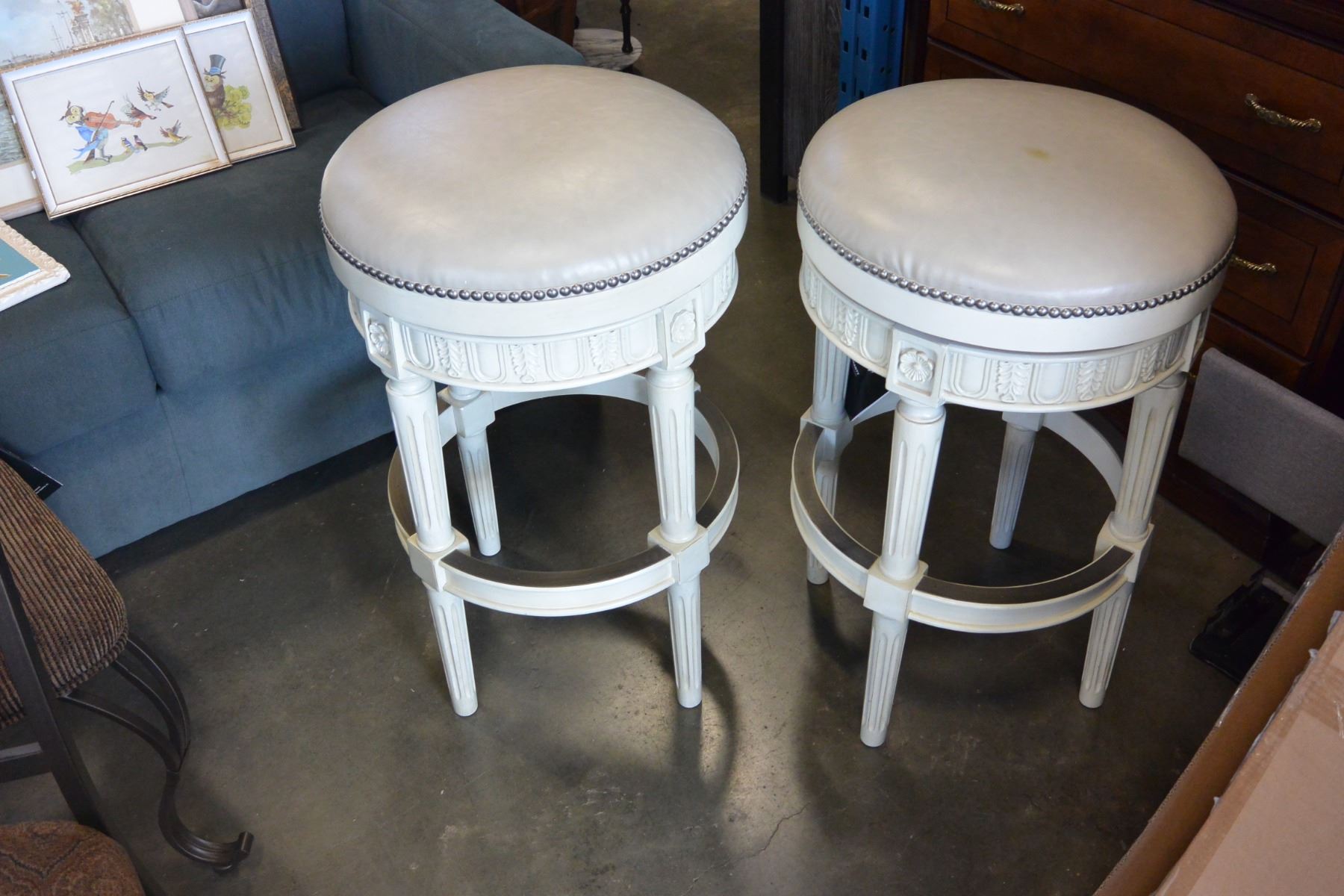 PAIR OF FLOOR MODEL ASHLEY SIGNATURE CARVED WHITE SWIVEL BARSTOOLS RETAIL $499 EACH