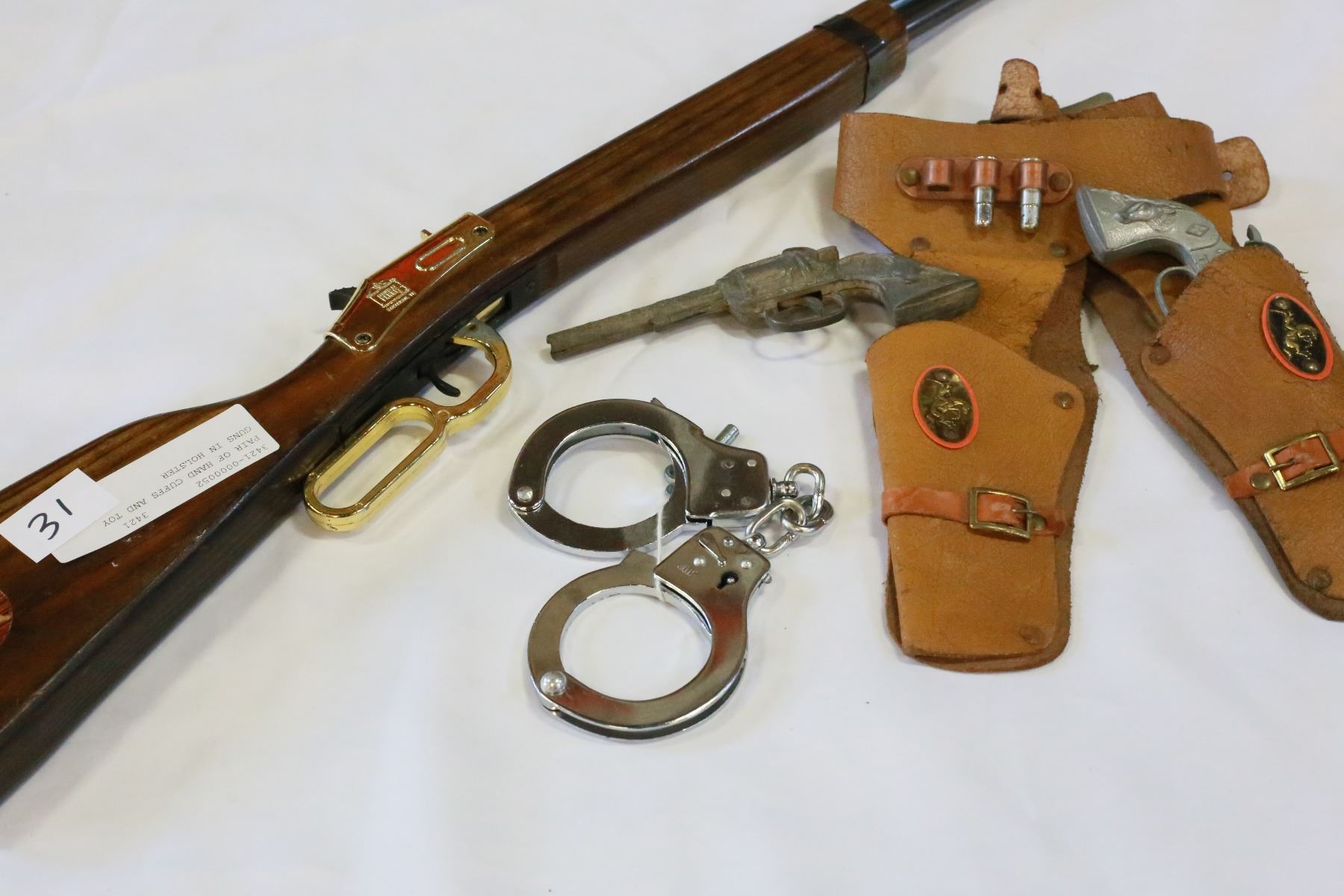 PAIR OF HAND CUFFS AND TOY GUNS IN HOLSTER