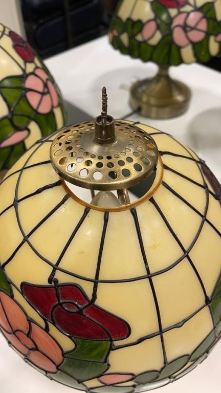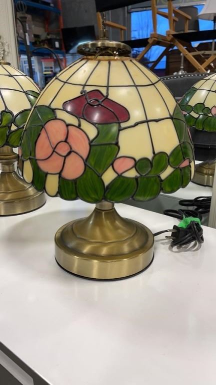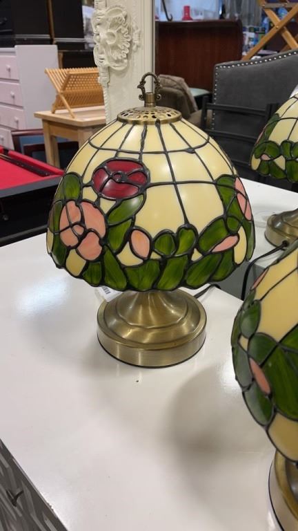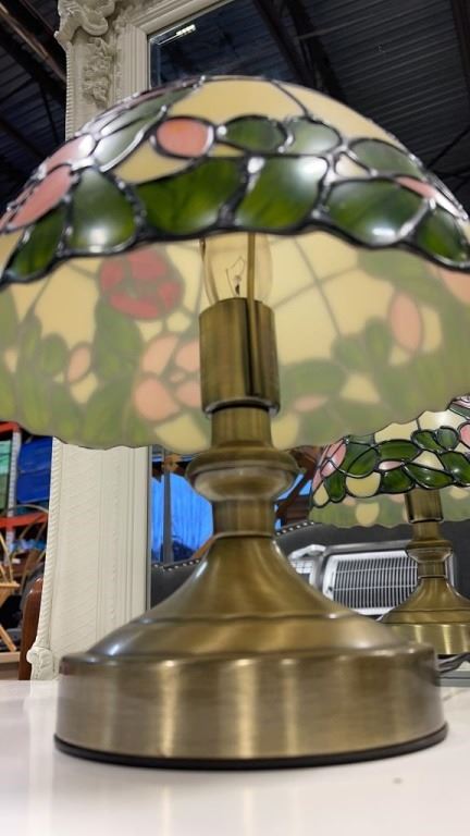 PAIR OF LEADED GLASS STYLE TABLE LAMPS - PLASTIC SHADES