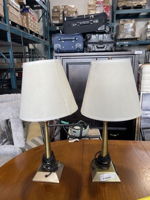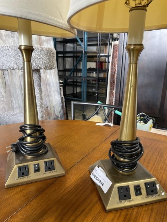 PAIR OF MATCHING BRASS LAMPS WITH POWER OUTLETS