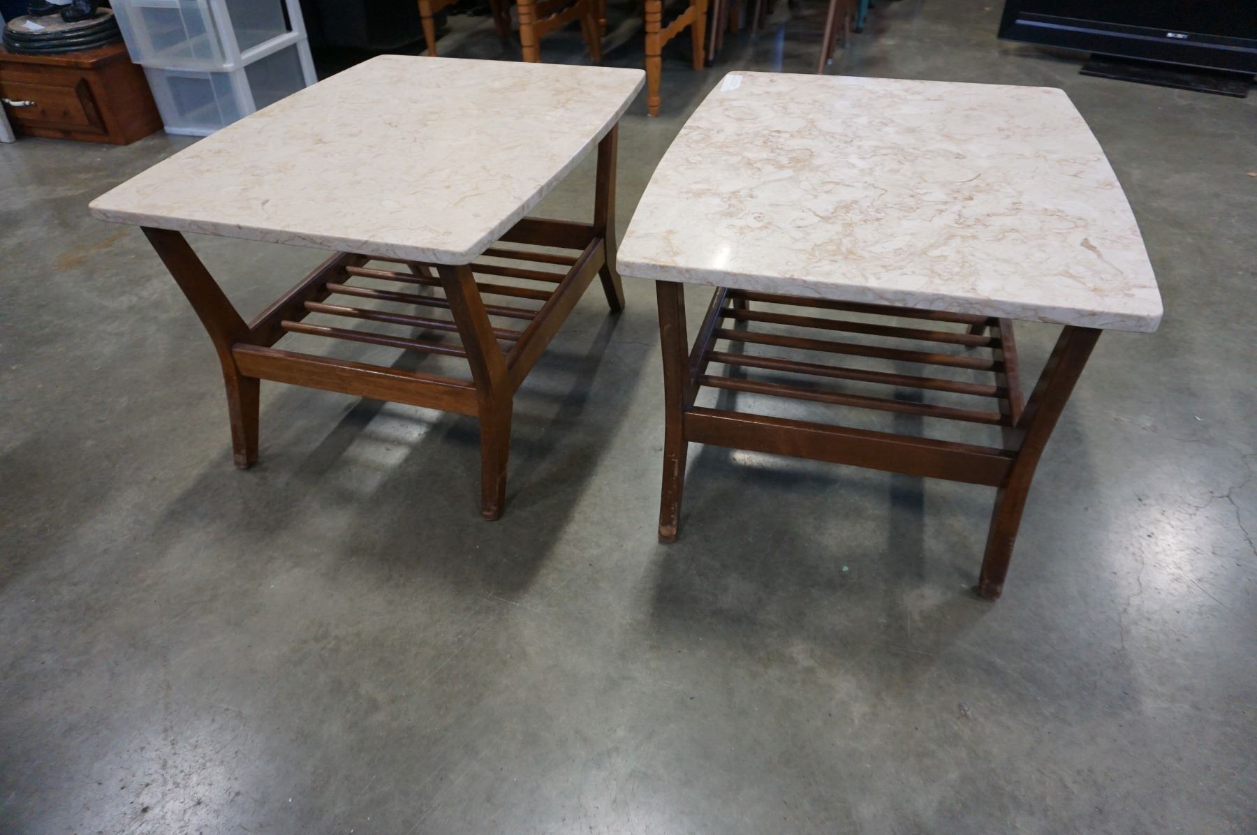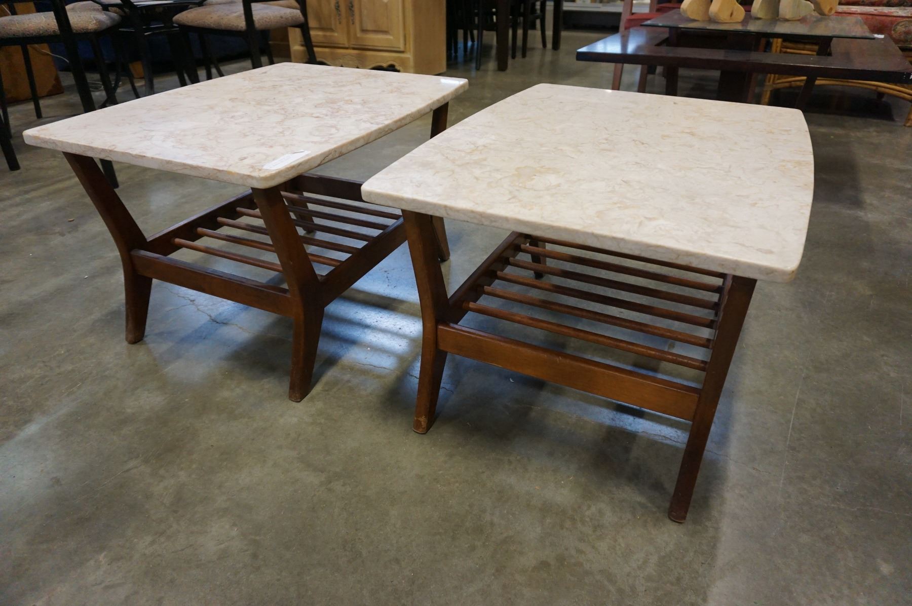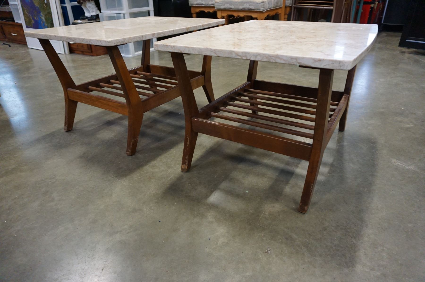 PAIR OF MID CENTURY MCM WALNUT AND MARBLE END TABLES