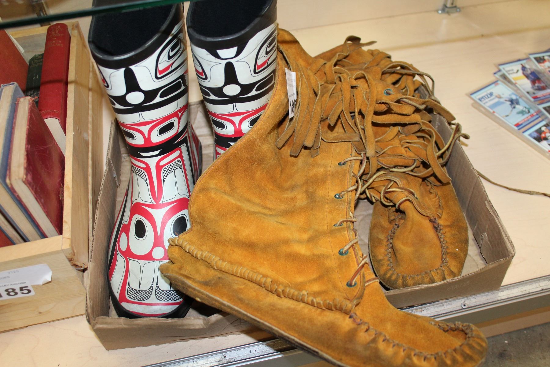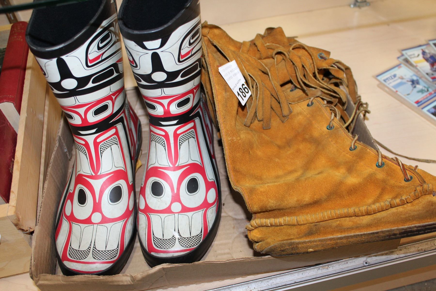 PAIR OF MOCCASINS AND NATIVE PAINTED RUBBER BOOTS