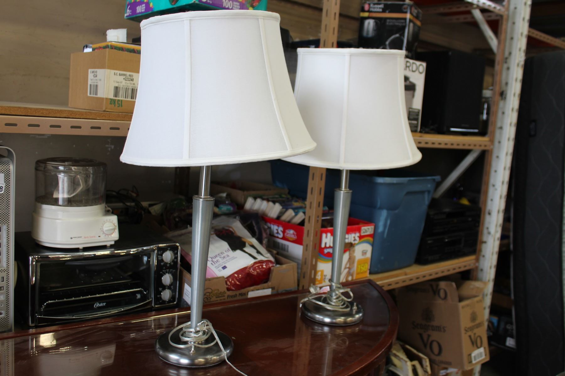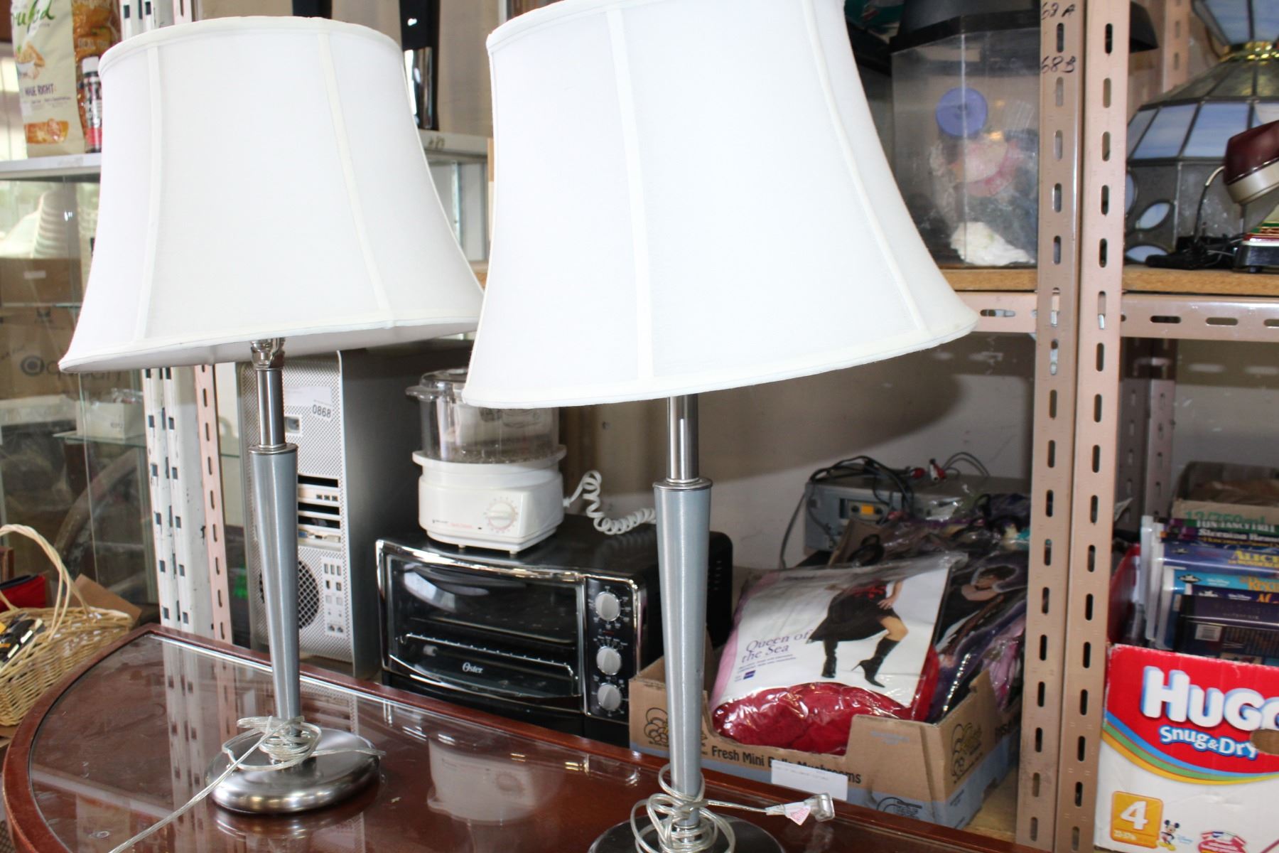 PAIR OF MODERN BRUSHED METAL TABLE LAMPS