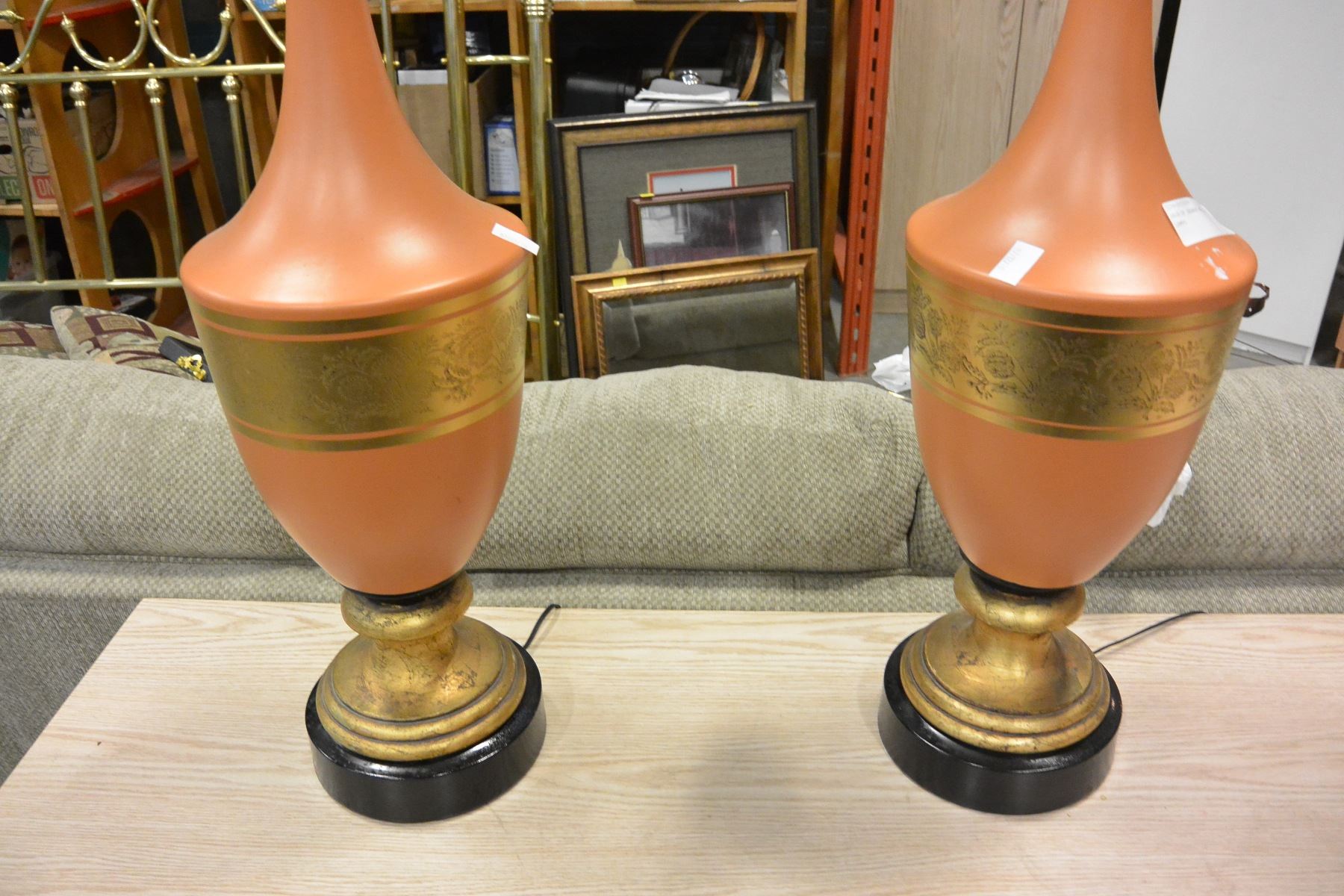 PAIR OF ORANGE AND GOLD TABLE LAMPS