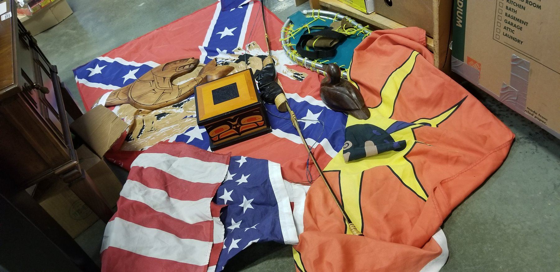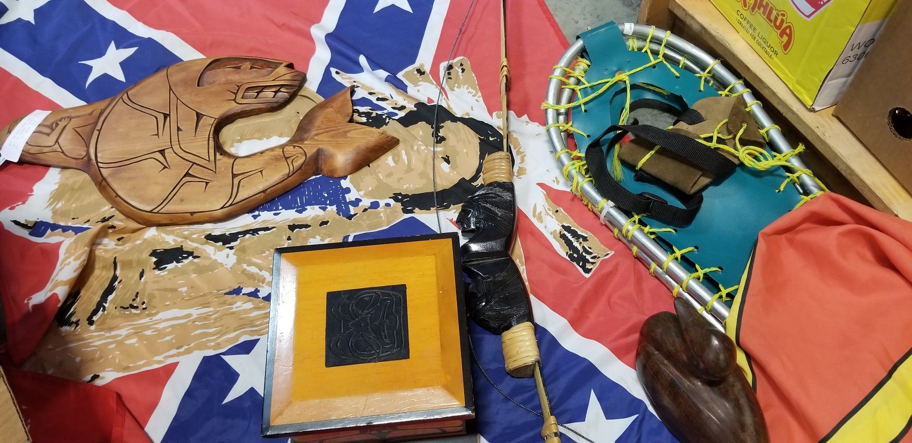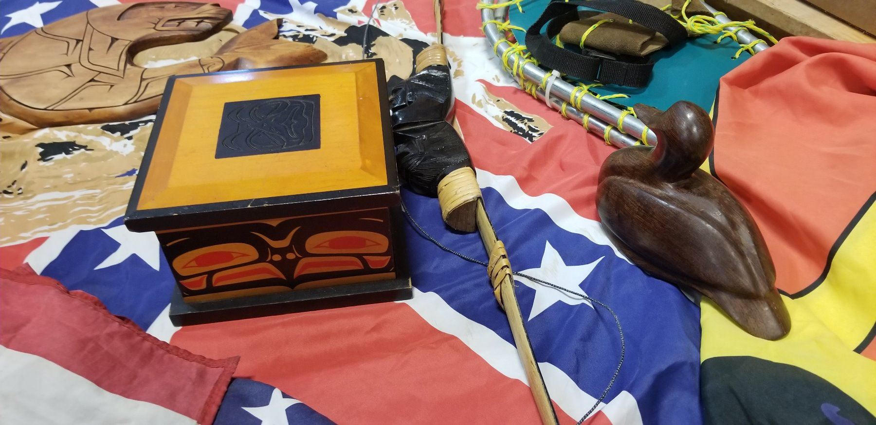 PAIR OF SNOW SHOES AND FIRST NATION FLAGS, CARVED NATIVE ITEMS, AND WOOD DUCK W/ BOW