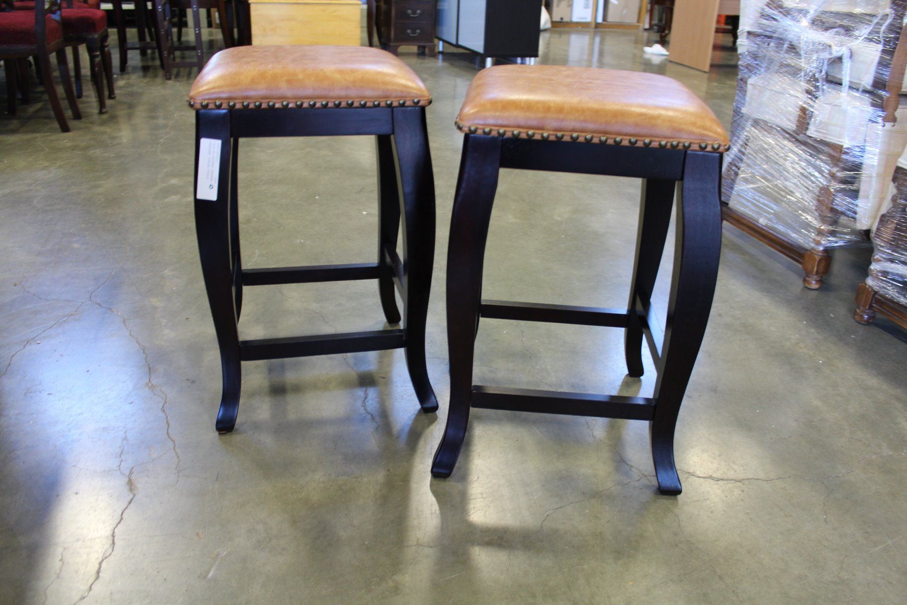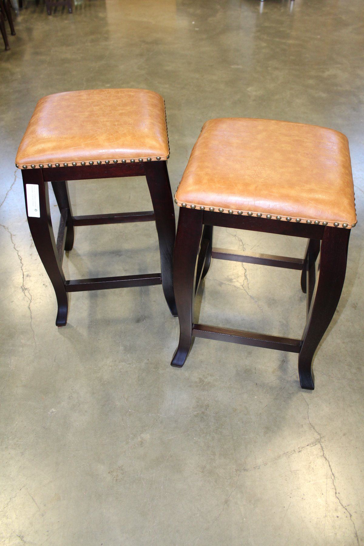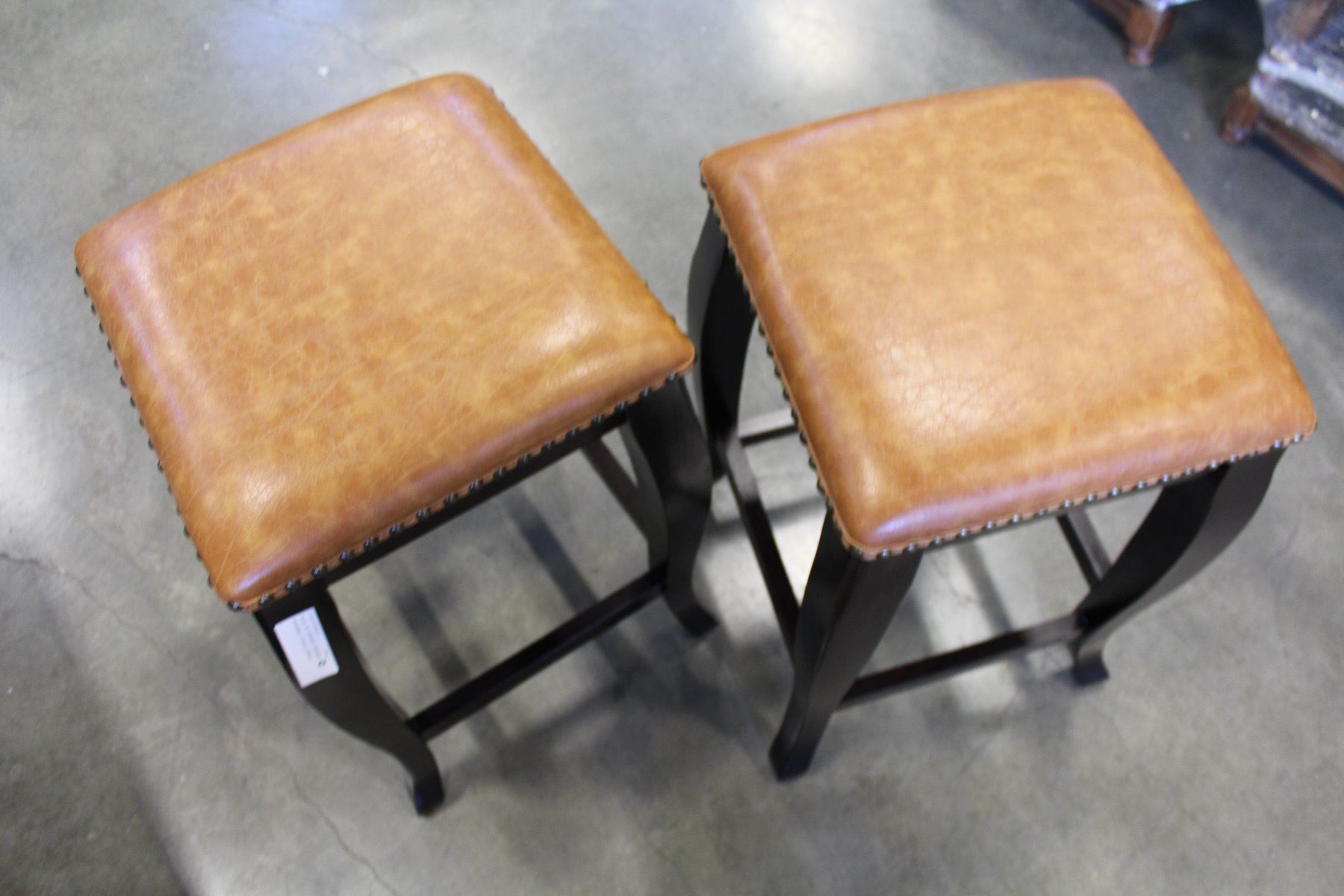 PAIR OF STUDDED LEATHER MAHOGANY FINISH STOOLS