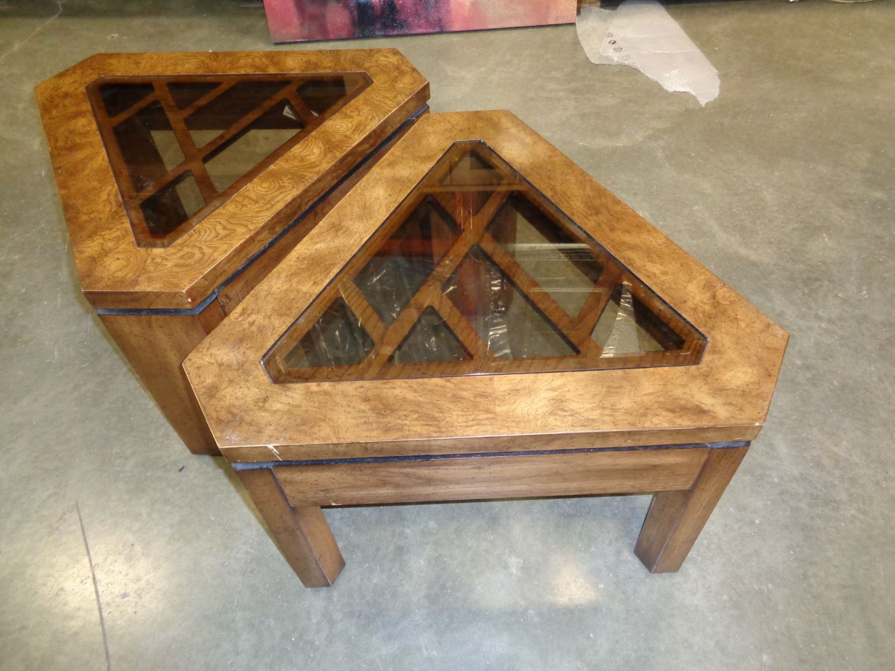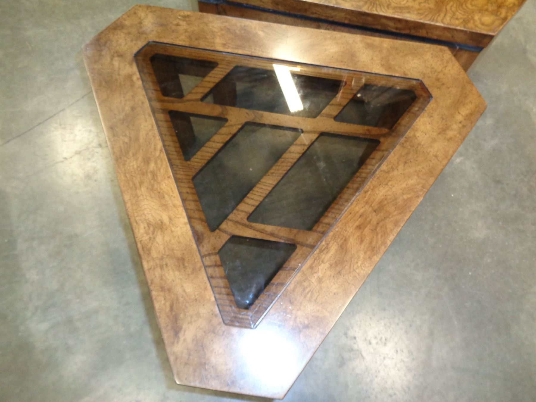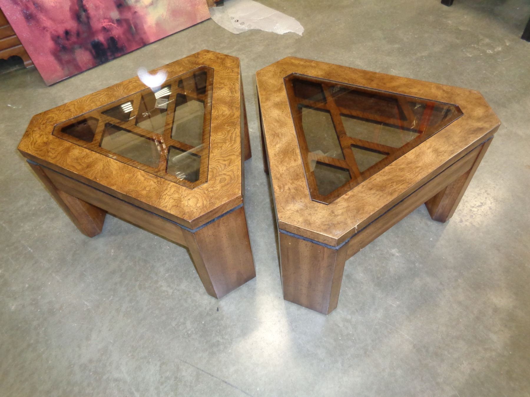 PAIR OF TRIANGLE WALNUT GLASS TOP ENDTABLE