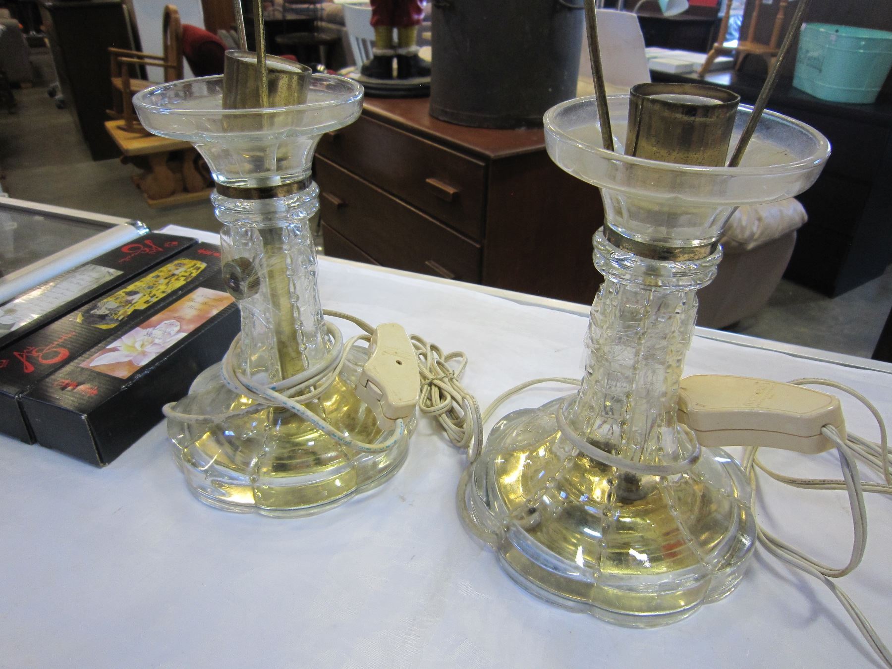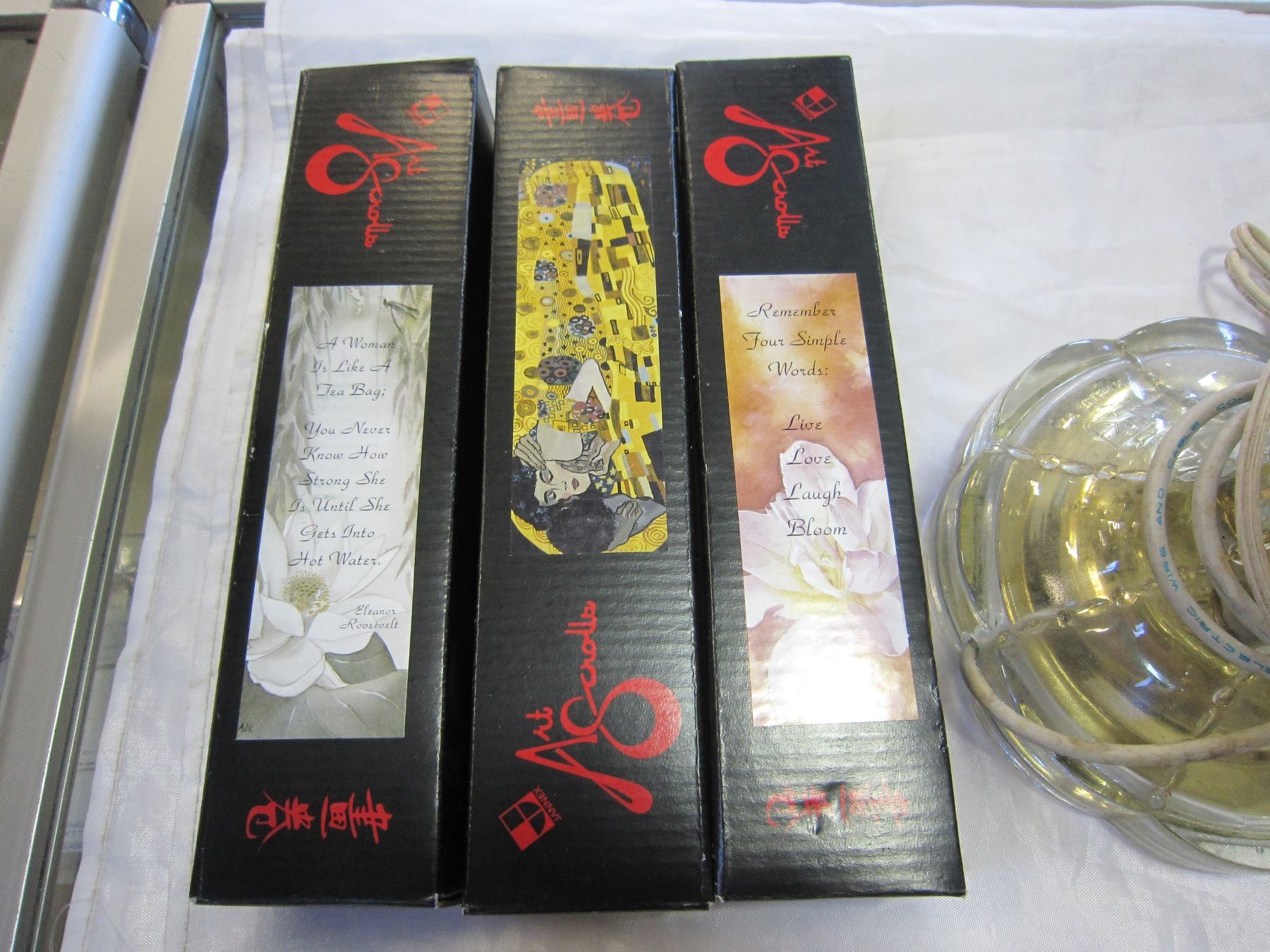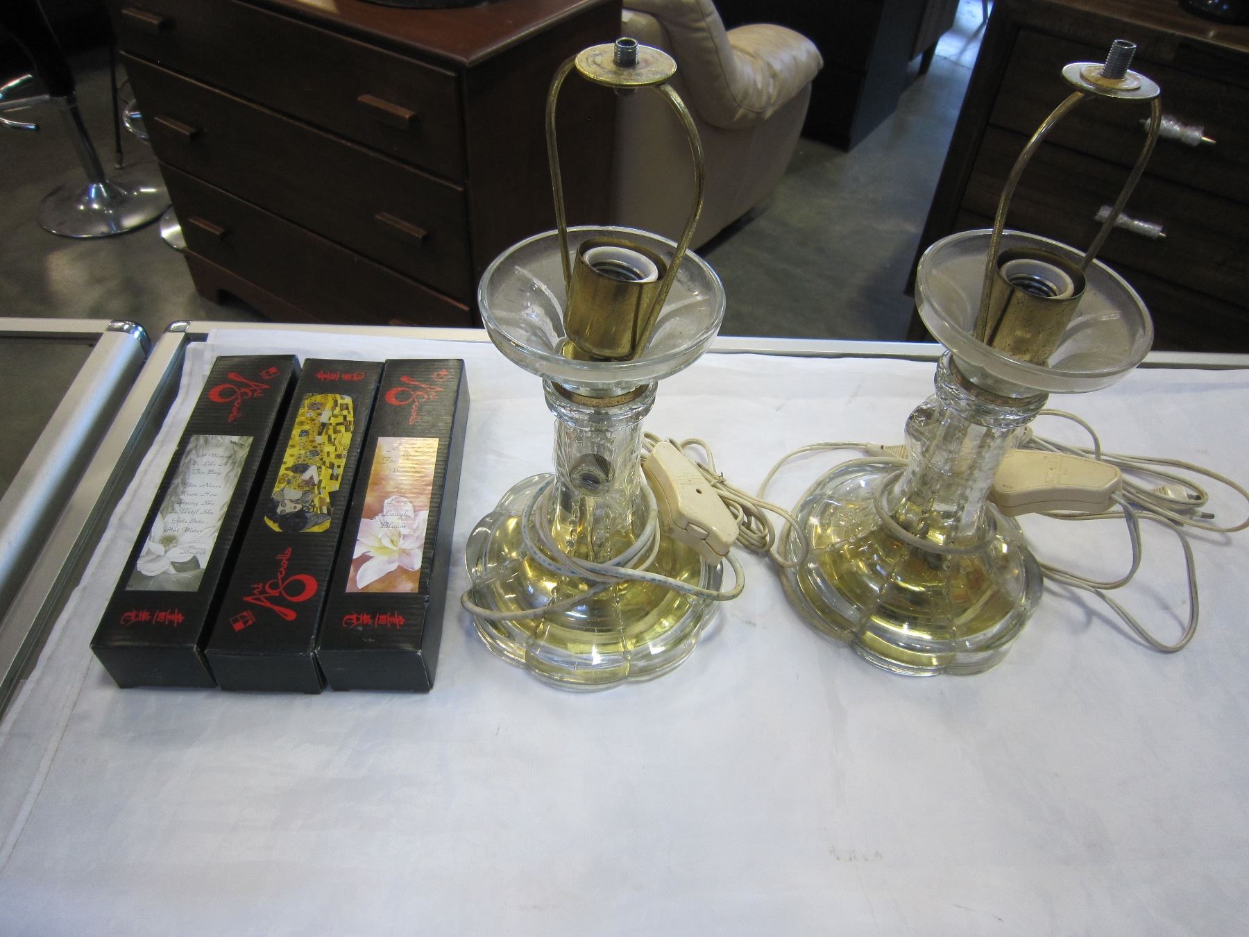 PAIR OF VINTAGE GLASS LAMPS AND 3 ART SCROLLS IN BOX