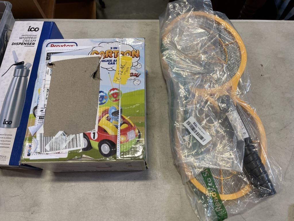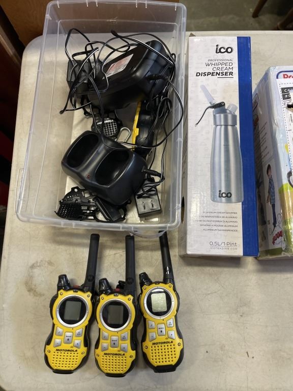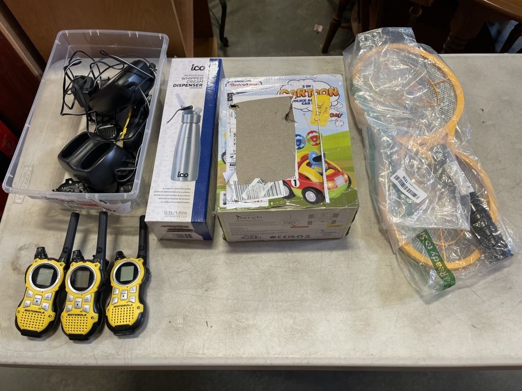 PAIR OF WALKIE TALKIES WITH DOCK, RC CARS, WHIPPED CREAM DISPENSER AND 2 ELECTRIC SWATTERS